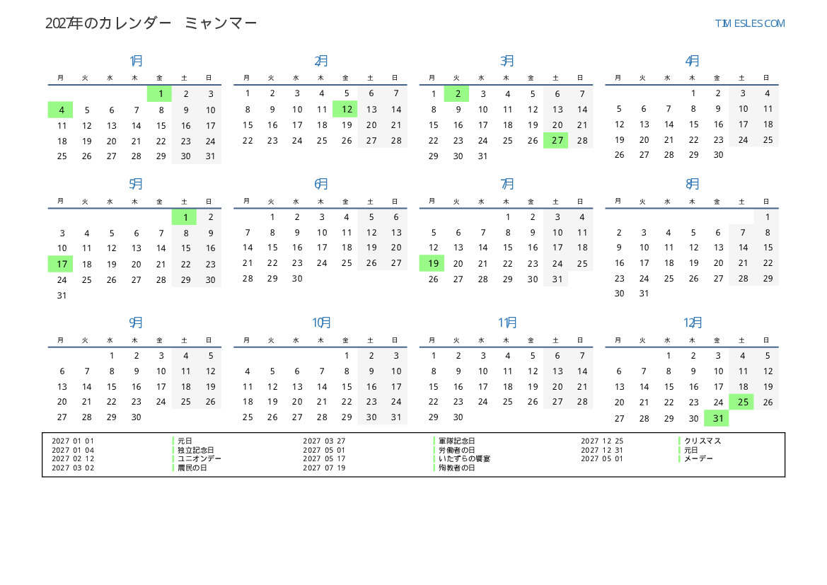 ミャンマー向けの2027年の休日と週末のカレンダー