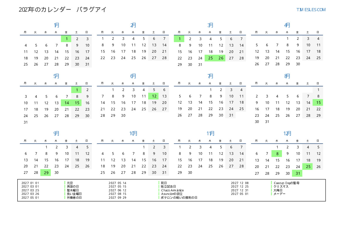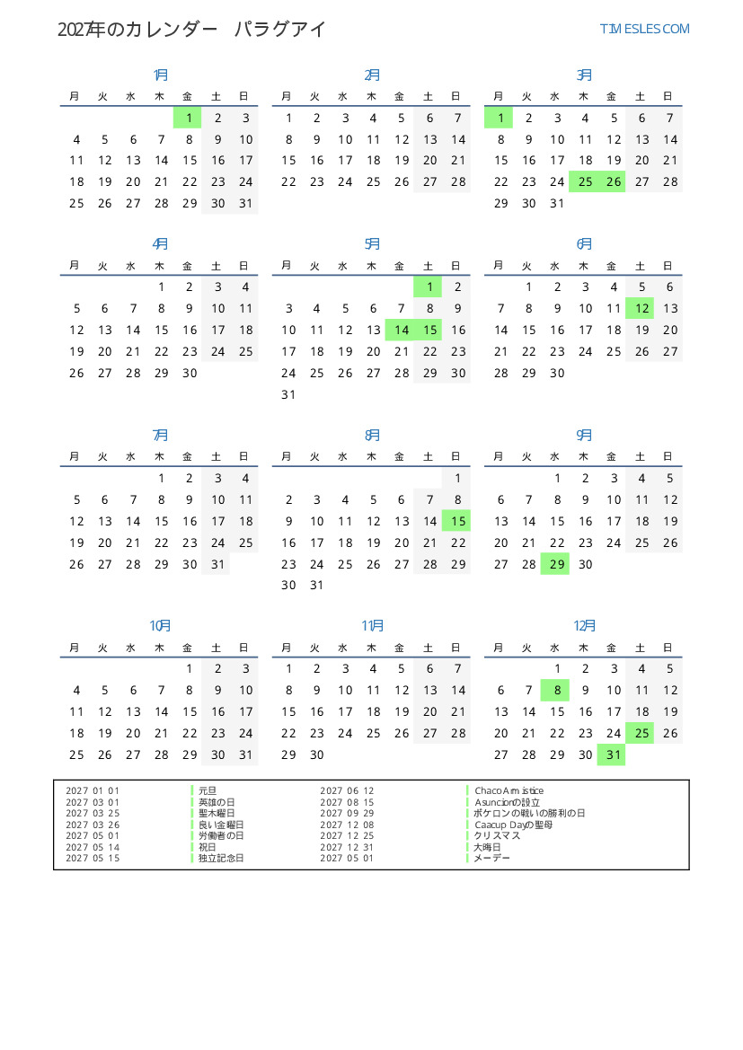 パラグアイ向けの2027年の休日と週末のカレンダー