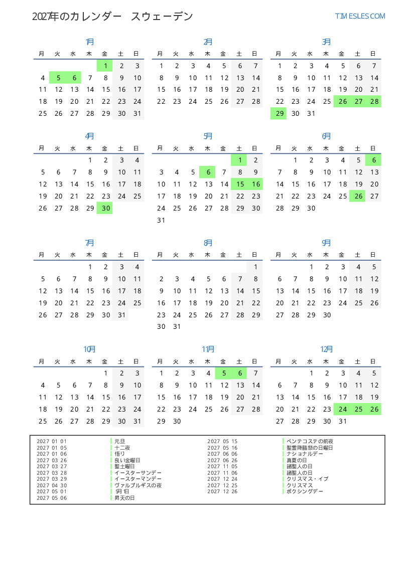 スウェーデン向けの2027年の休日と週末のカレンダー