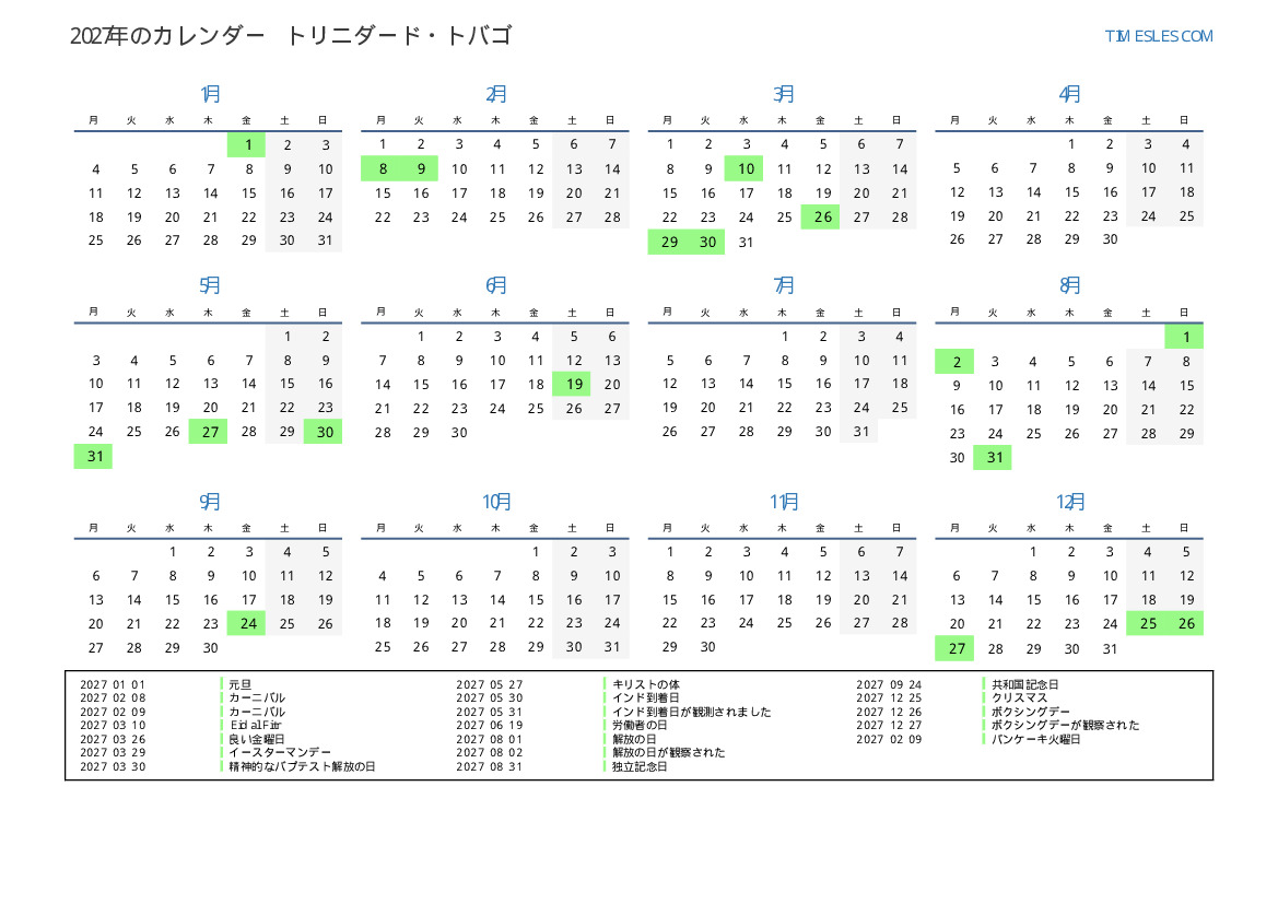 トリニダード・トバゴのためにの2027年の休日と週末のカレンダー