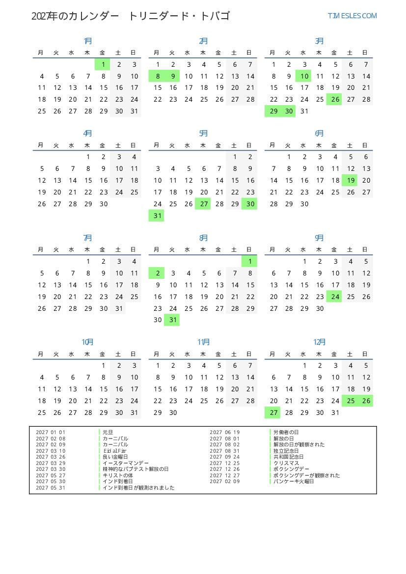 トリニダード・トバゴのために2027年の休日と週末を含むPDFカレンダーをダウンロードして印刷します