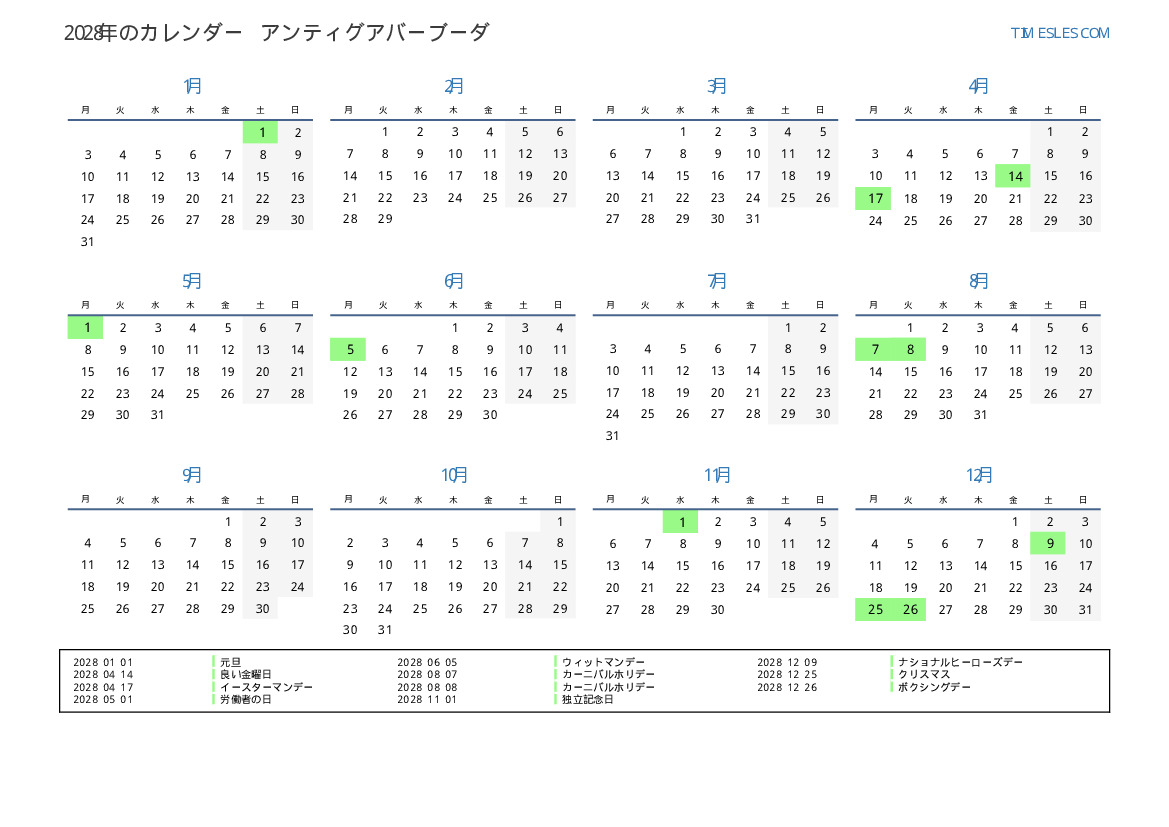 アンティグアバーブーダの2028年の休日と週末のカレンダー
