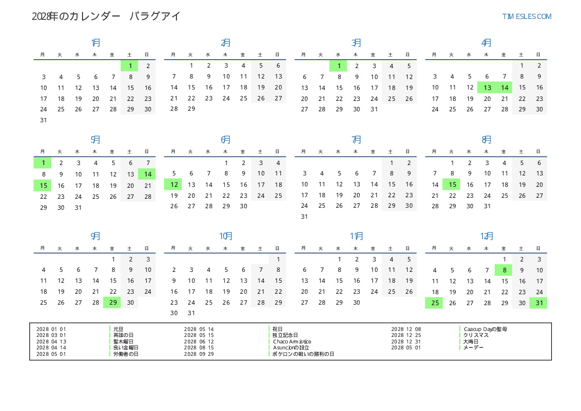 パラグアイ向け2028年カレンダー