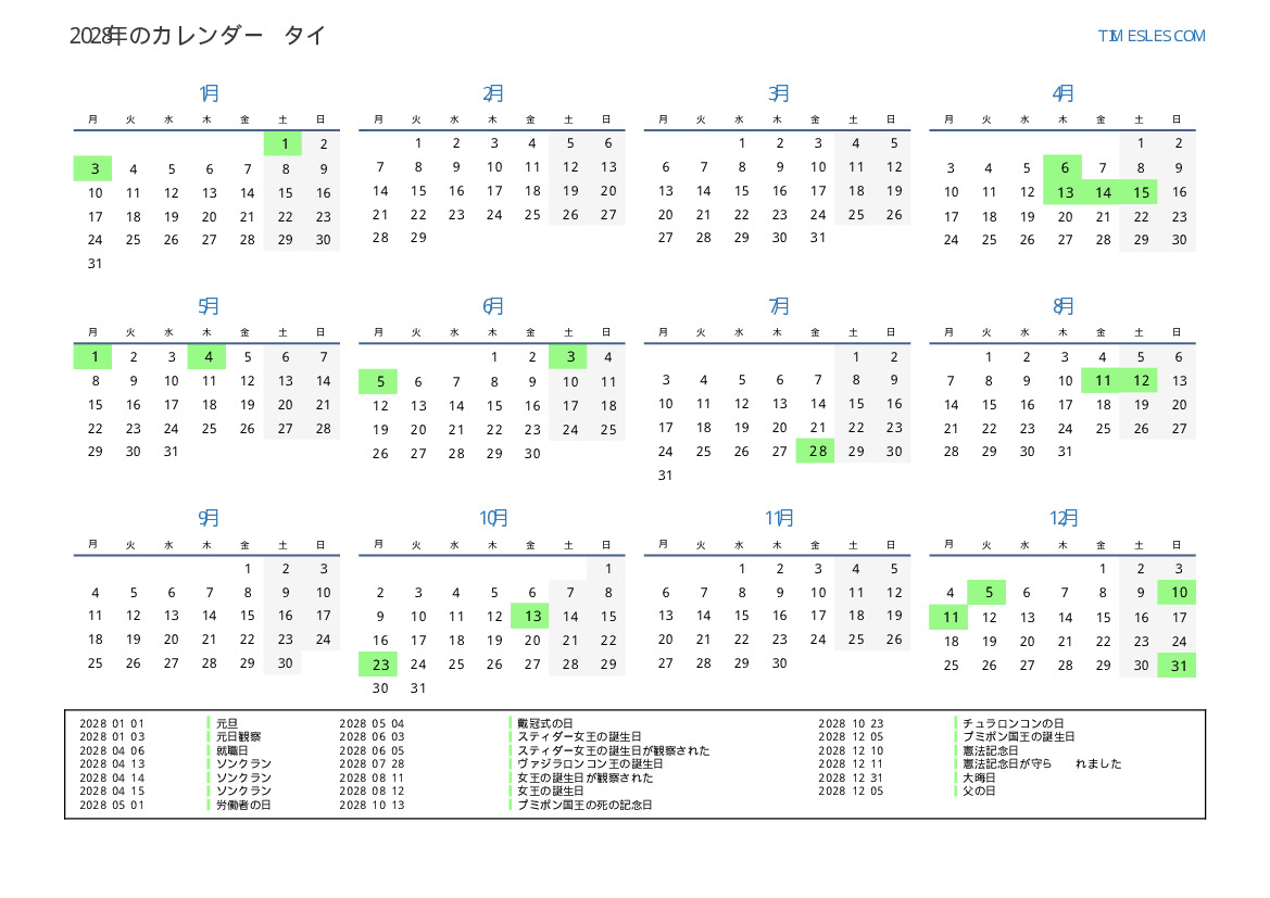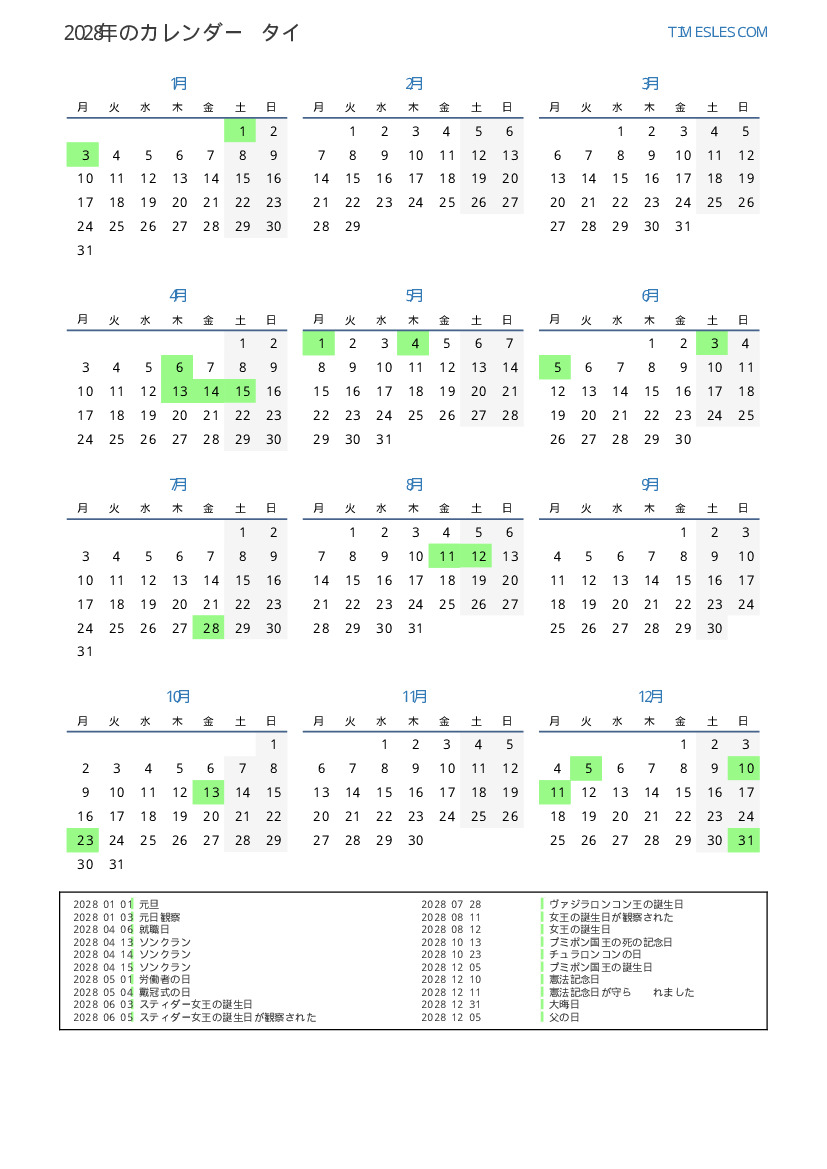 タイ向け2028年の休日と週末を含むPDFカレンダーをダウンロードして印刷します