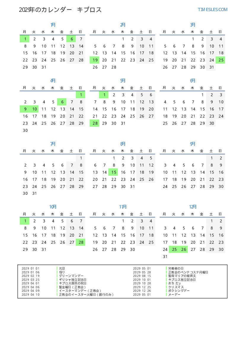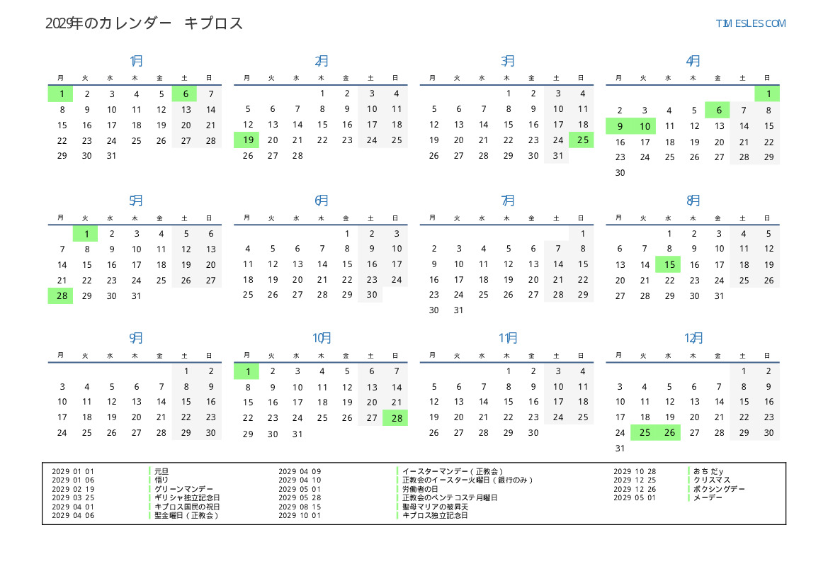 キプロス向け2029年の休日と週末を含むPDFカレンダーをダウンロードして印刷します