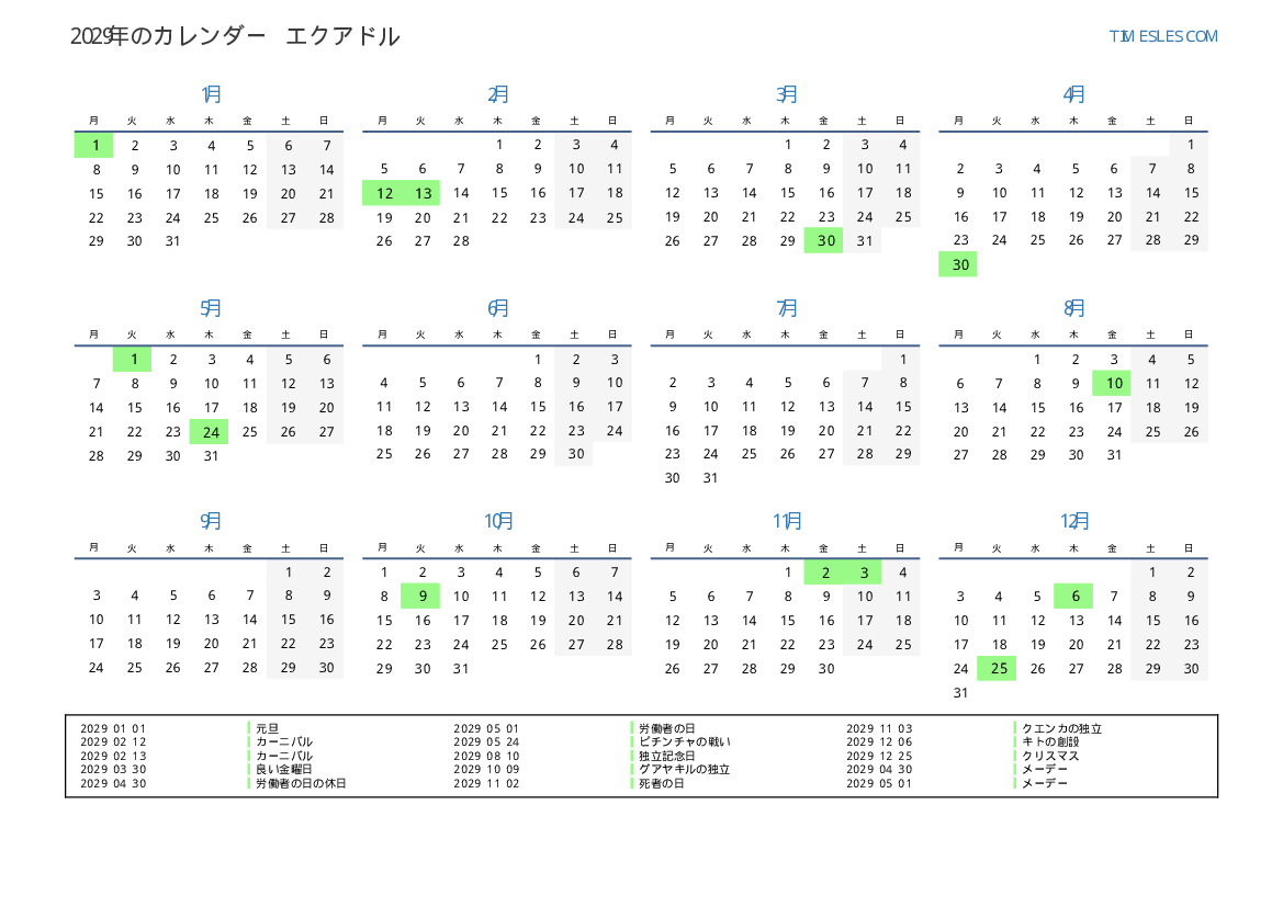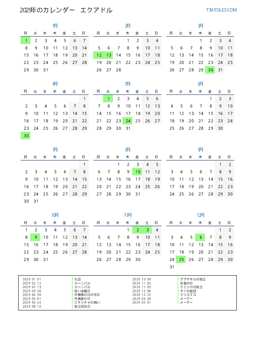 エクアドル向け2029年の休日と週末を含むPDFカレンダーをダウンロードして印刷します