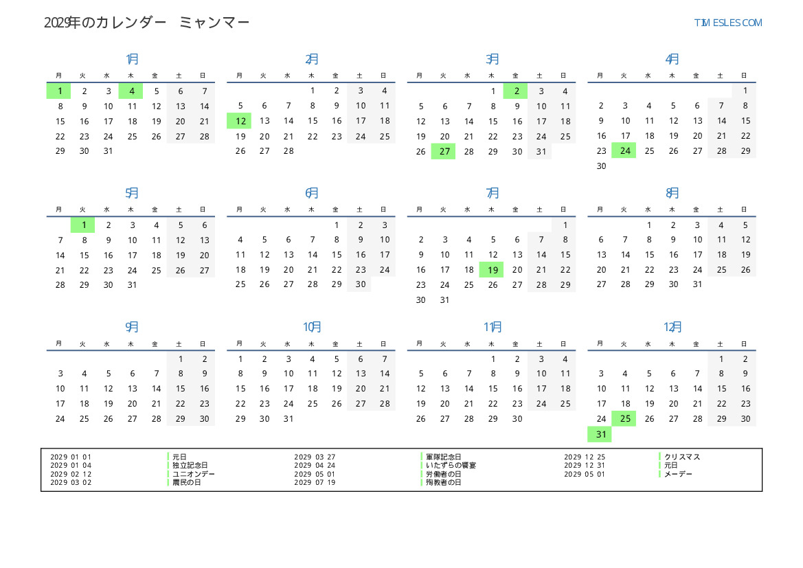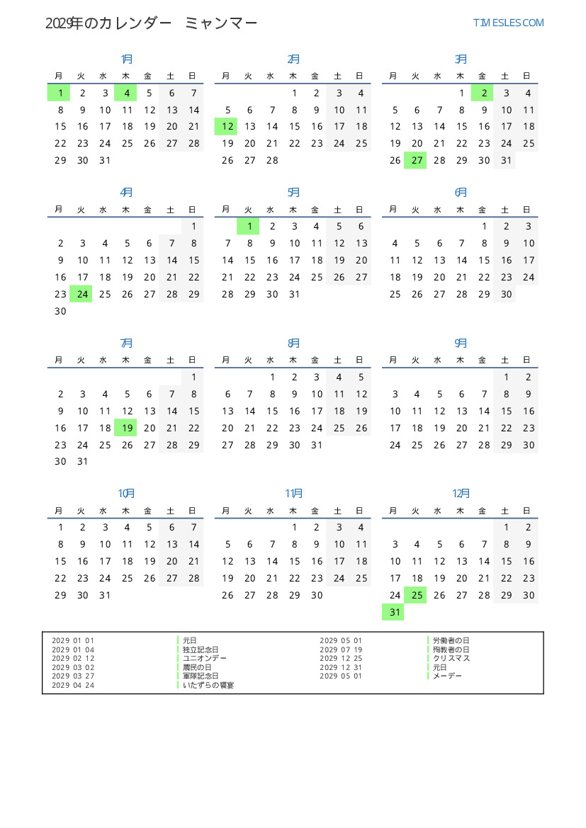 ミャンマー向けの2029年の休日と週末のカレンダー