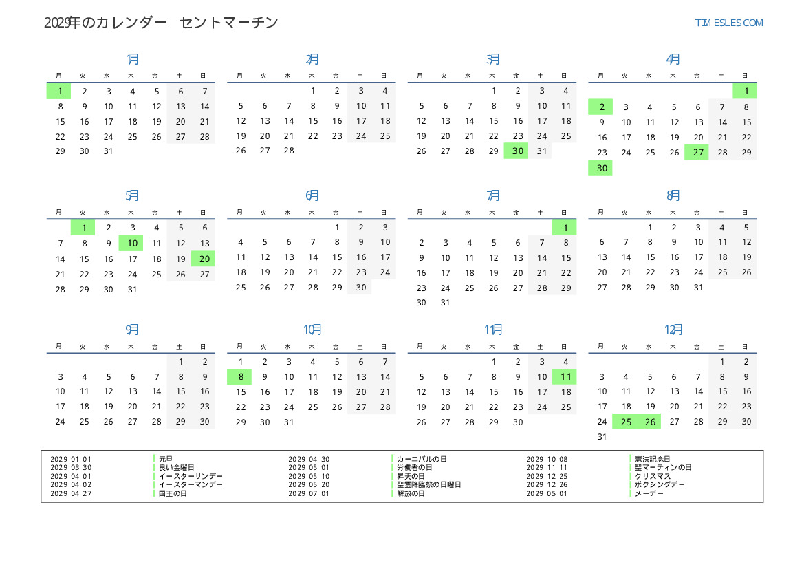 グレゴリオ暦、うるう年ではありません、年間365日。 2029年には、シントマールテンで19 休日と休日。 中国東部の暦では、2000年おんどりの年。 年は月曜日にに始まり、月曜日に終わります。