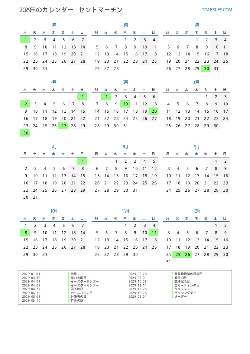 SintMaartenの場合2029年カレンダー
