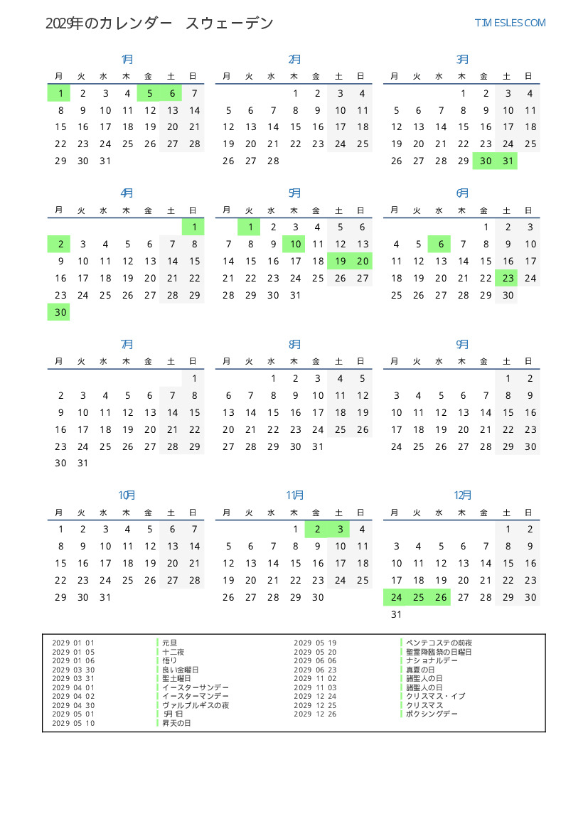 スウェーデン向けの2029年の休日と週末のカレンダー