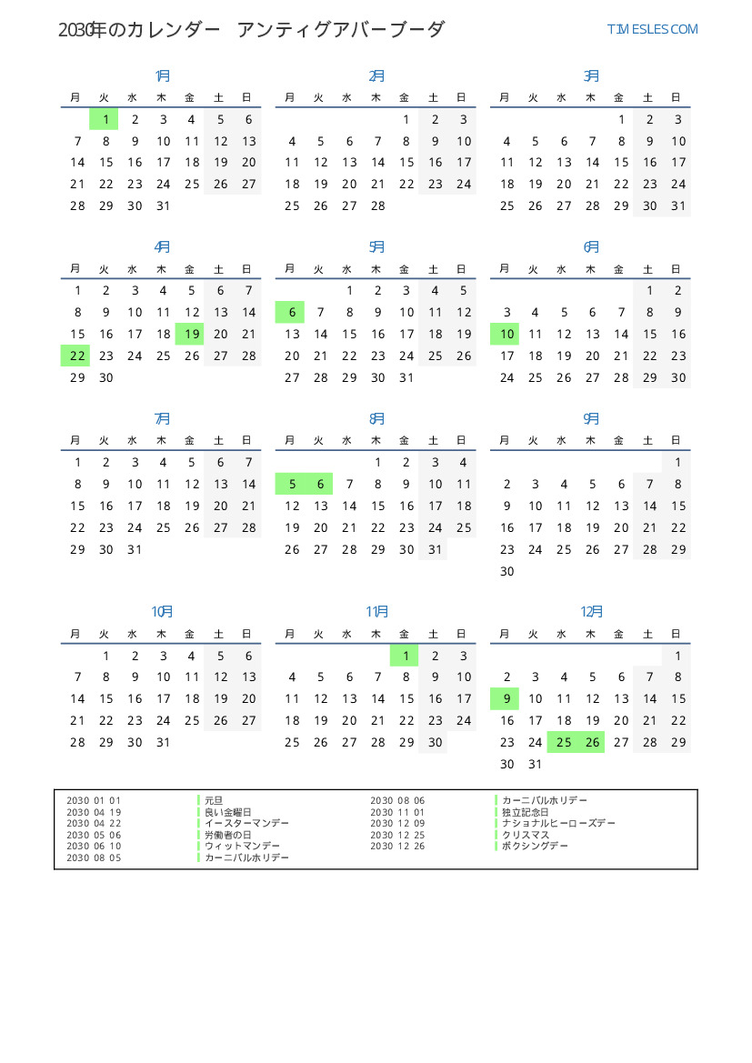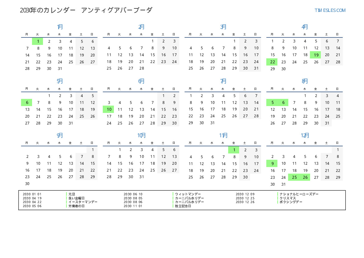 アンティグアバーブーダの2030年の休日と週末のカレンダー