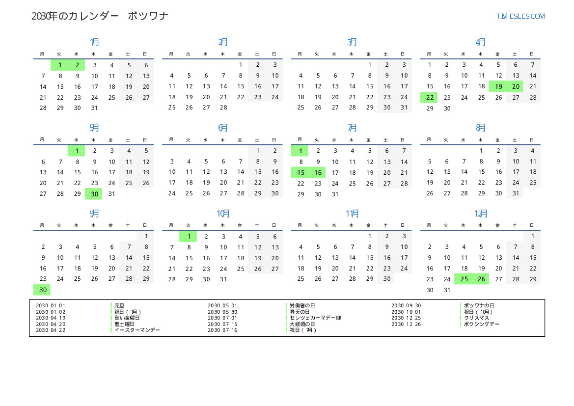 ボツワナ向けの2030年の休日と週末のカレンダー