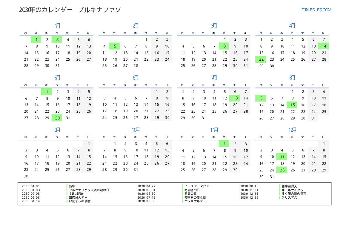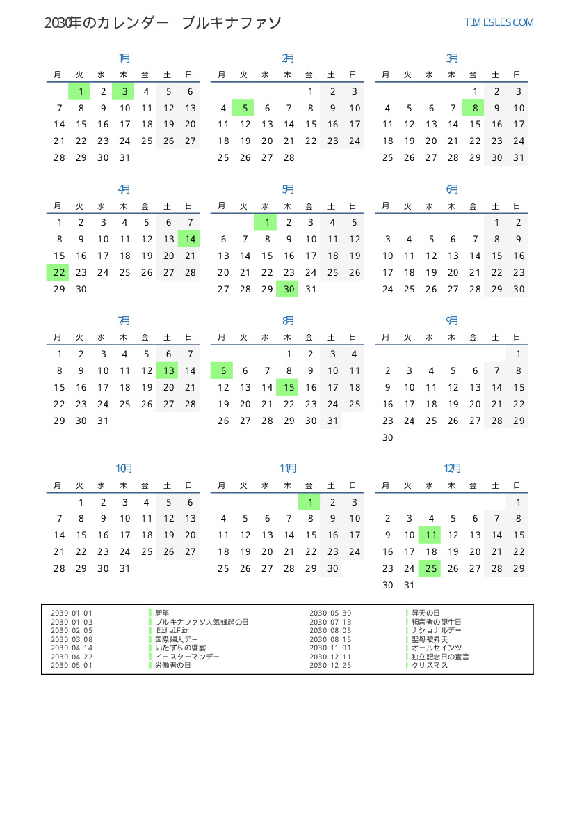 ブルキナファソ2030年の休日と週末を含むPDFカレンダーをダウンロードして印刷します