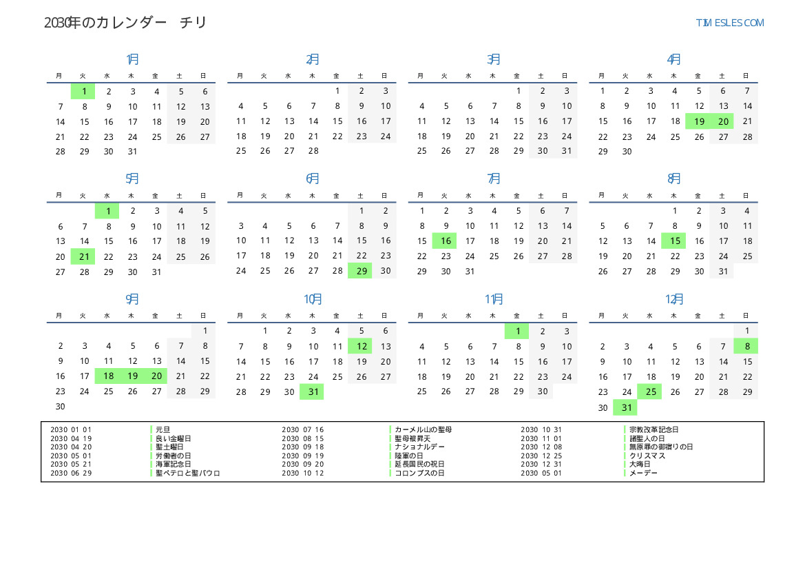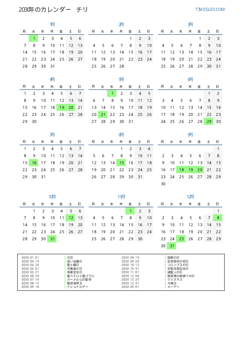 チリ向け2030年の休日と週末を含むPDFカレンダーをダウンロードして印刷します