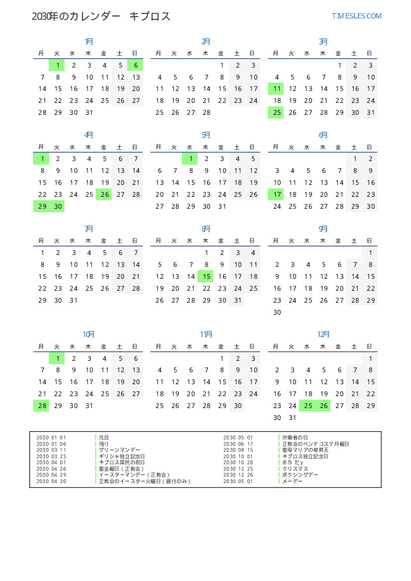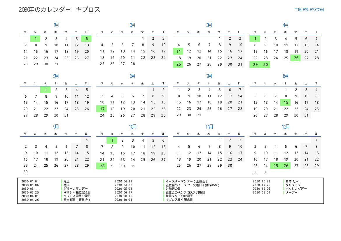 キプロス向け2030年の休日と週末を含むPDFカレンダーをダウンロードして印刷します