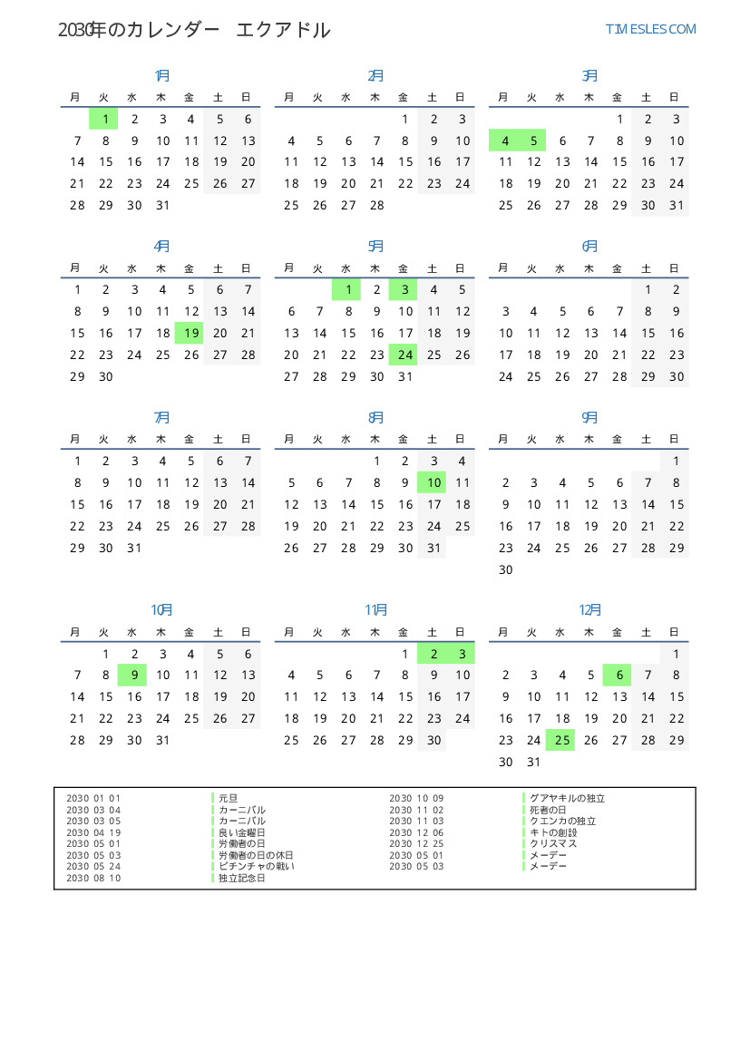 エクアドル向け2030年の休日と週末を含むPDFカレンダーをダウンロードして印刷します