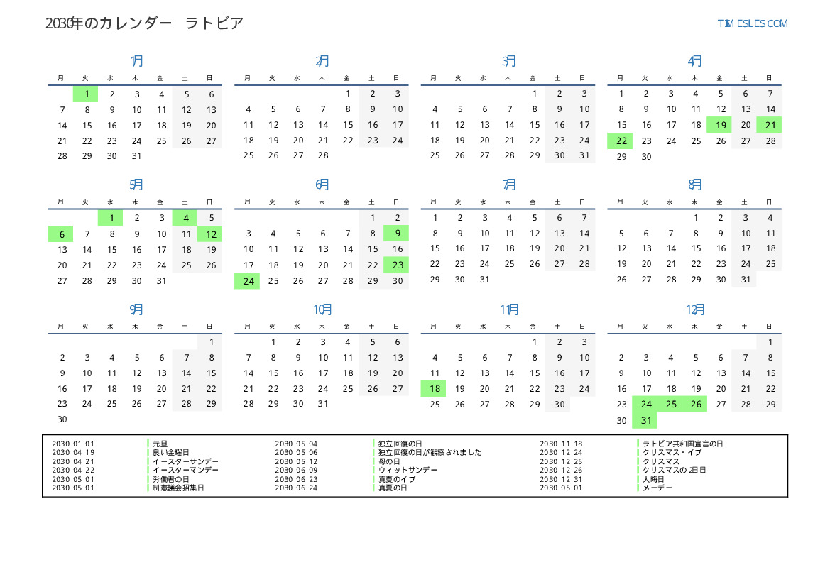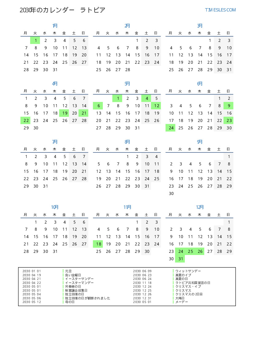 ラトビア向けの2030年の休日と週末のカレンダー