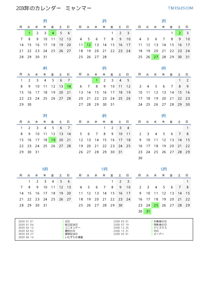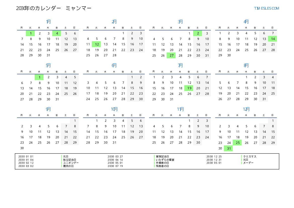 ミャンマー向けの2030年の休日と週末のカレンダー