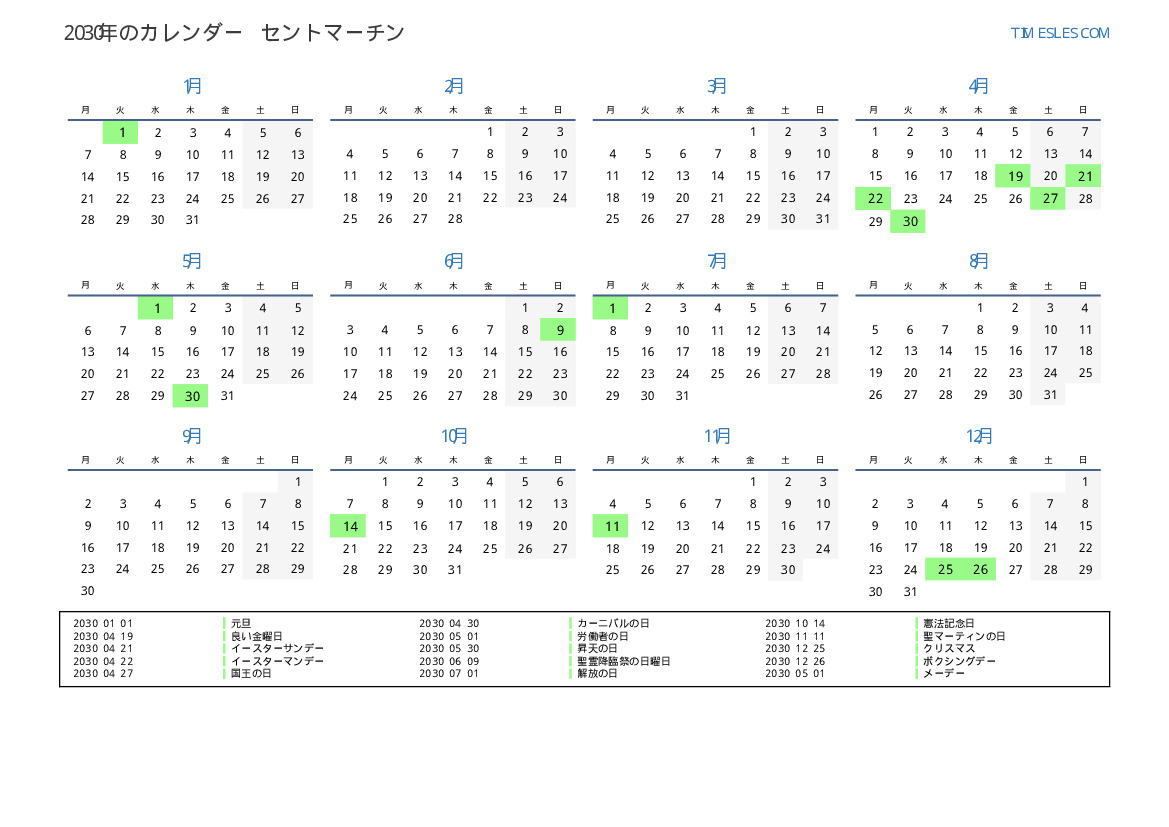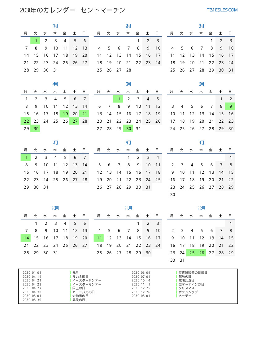 グレゴリオ暦、うるう年ではありません、年間365日。 2030年には、シントマールテンで19 休日と休日。 中国東部の暦では、2000年犬の年。 年は火曜日にに始まり、火曜日に終わります。