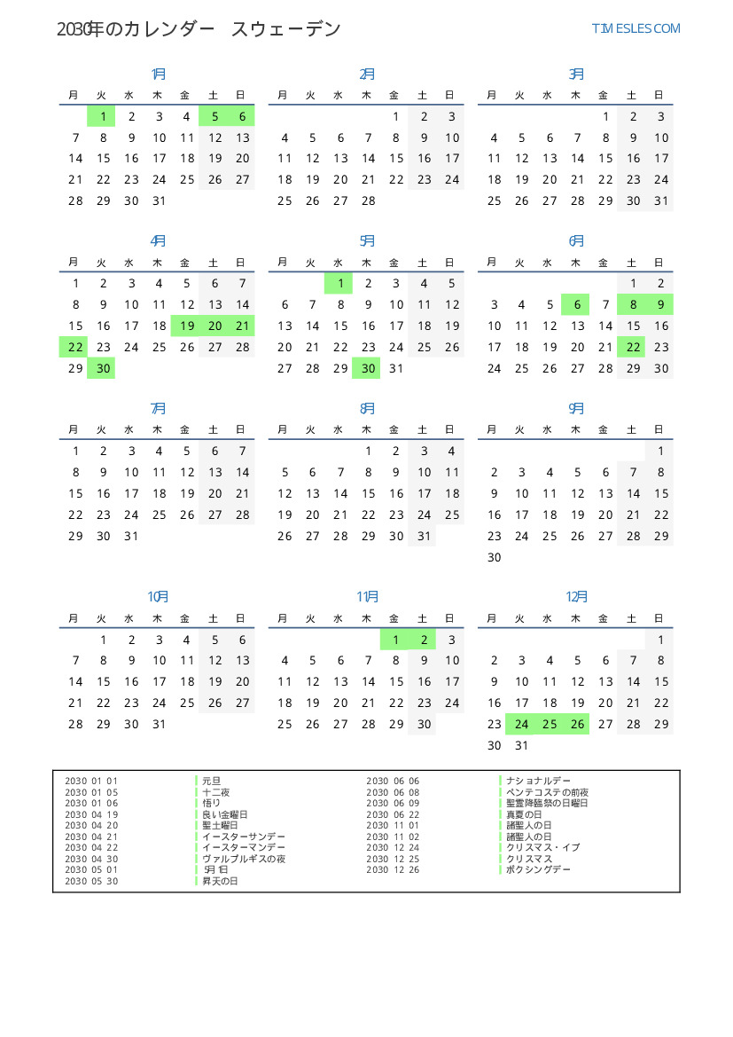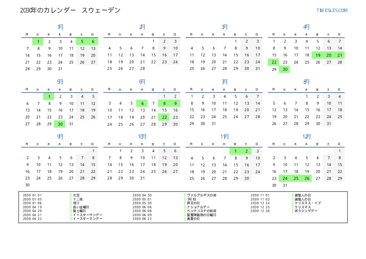 スウェーデン向けの2030年の休日と週末のカレンダー