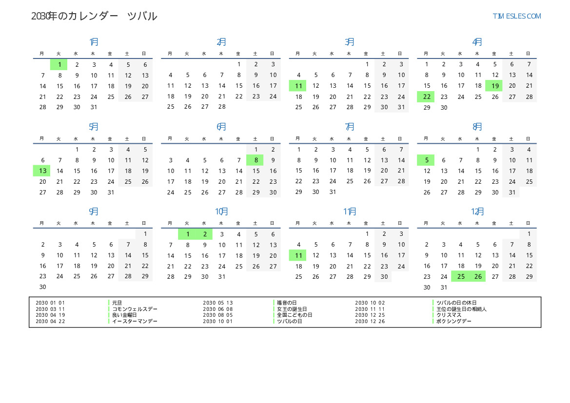 ツバル向けの2030年の休日と週末のカレンダー