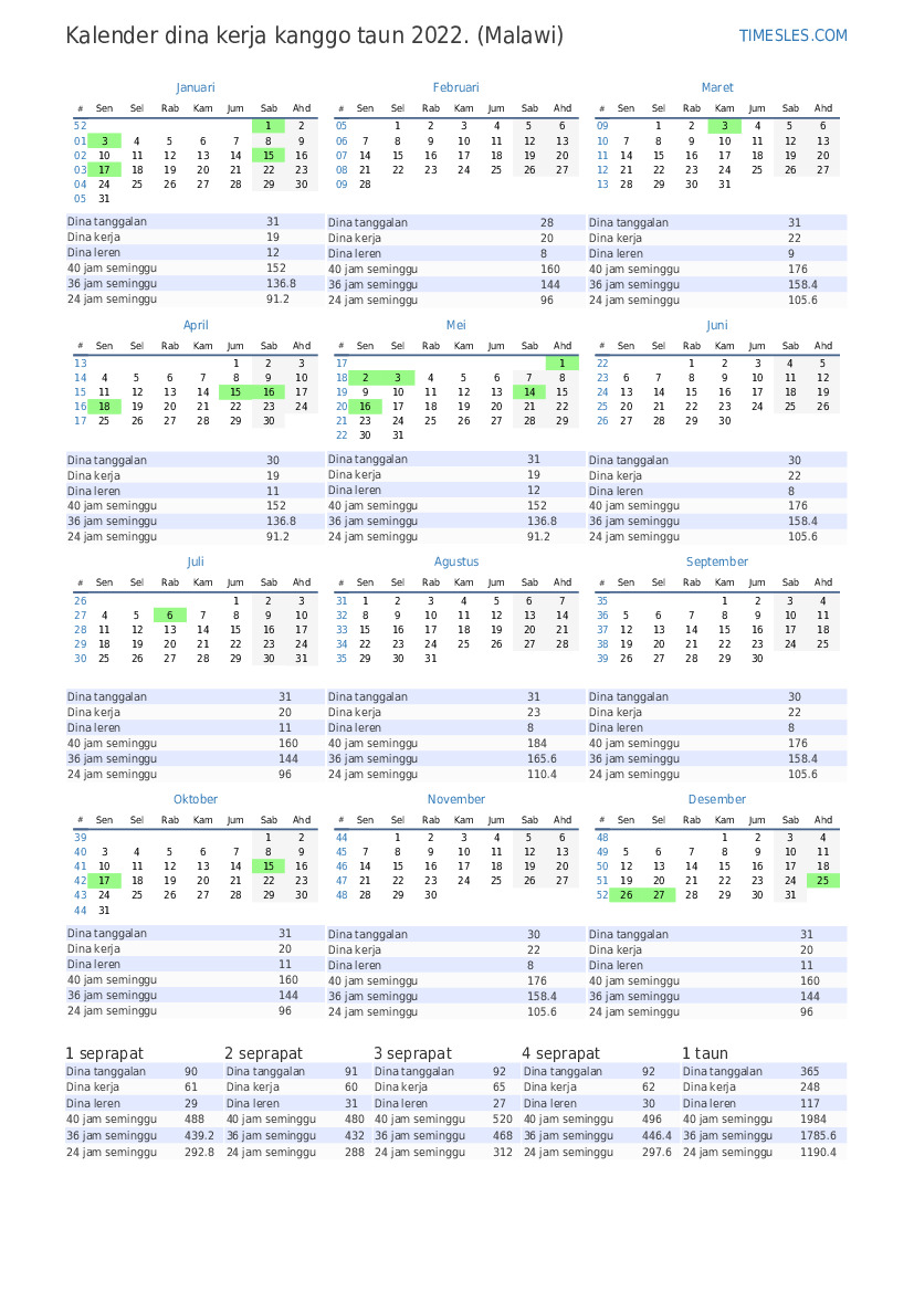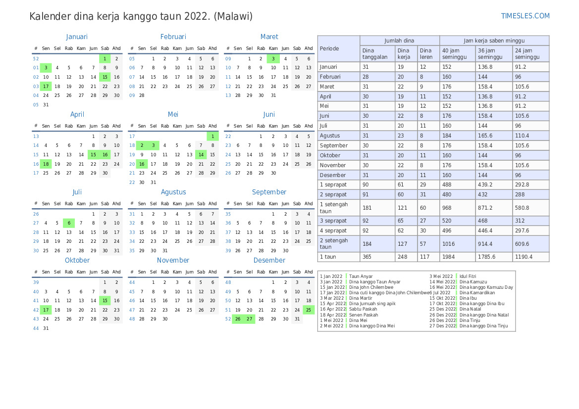 Kalender bisnis dina Agustus 2022 kanggo Malawi