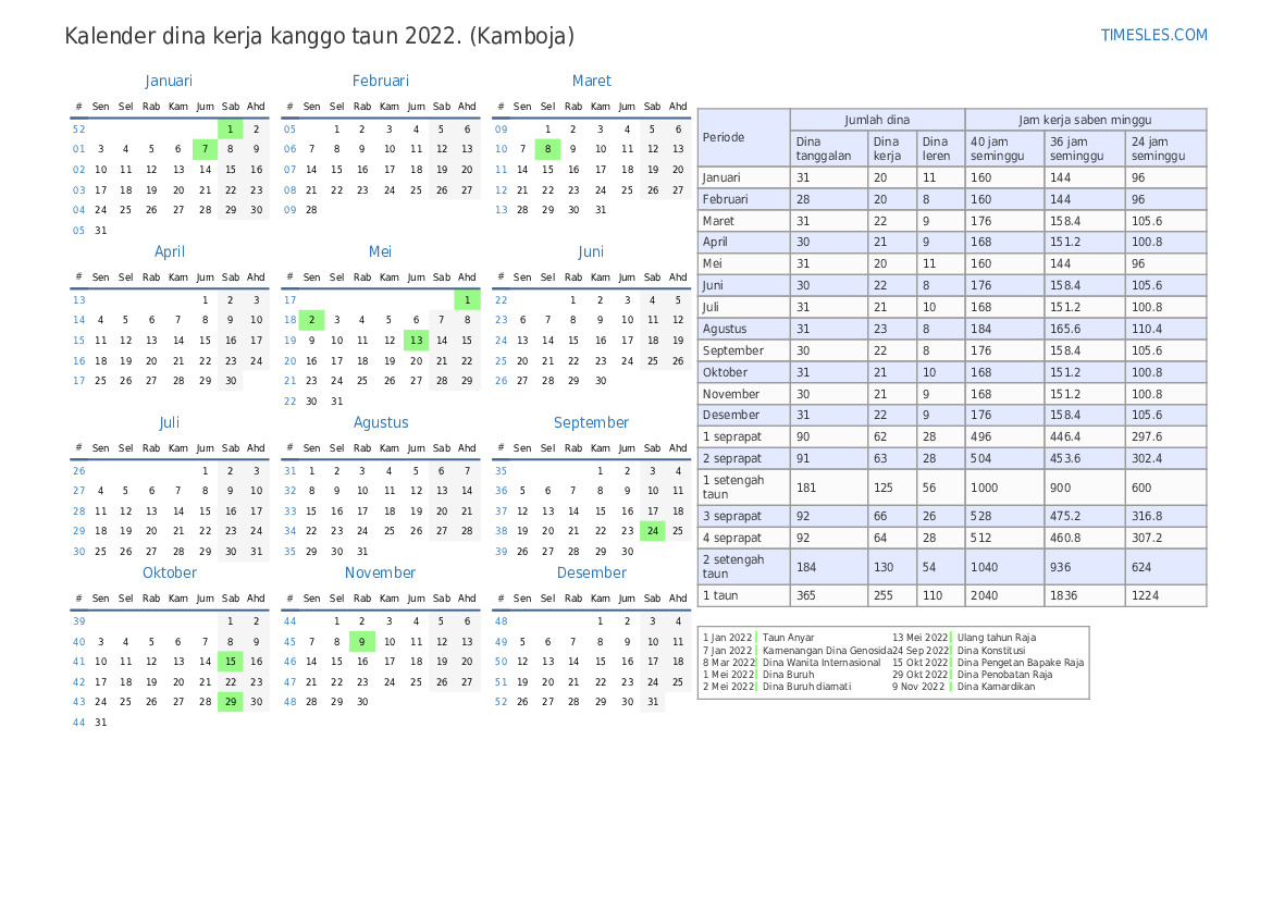 Kalender dina bisnis kanthi preinan lan akhir minggu kanggo kuartal 2 taun 2022 kanggo Kamboja