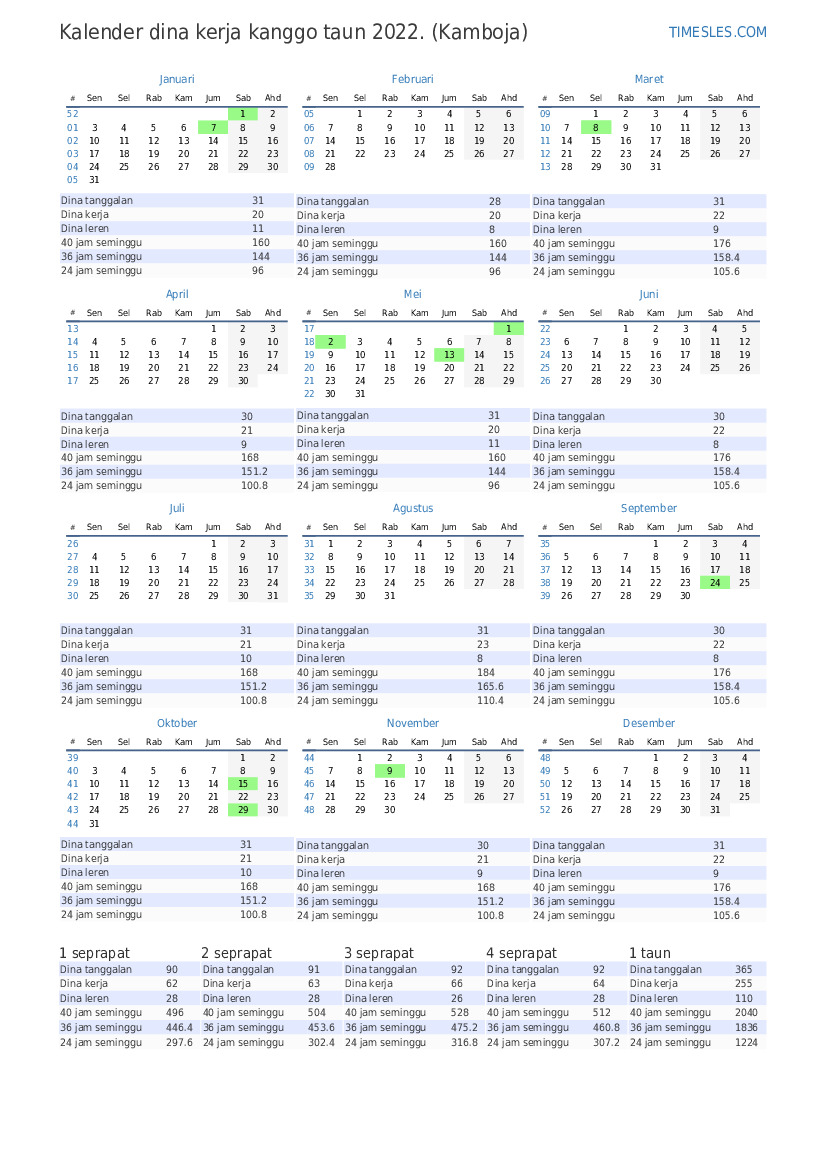 Kanggo kuartal kaping 2 taun 2022, ana 7 preinan lan dina dina ing Kamboja. Kuartal kaping 2 2022 diwiwiti dina Jumuah lan pungkasan dina Kemis.