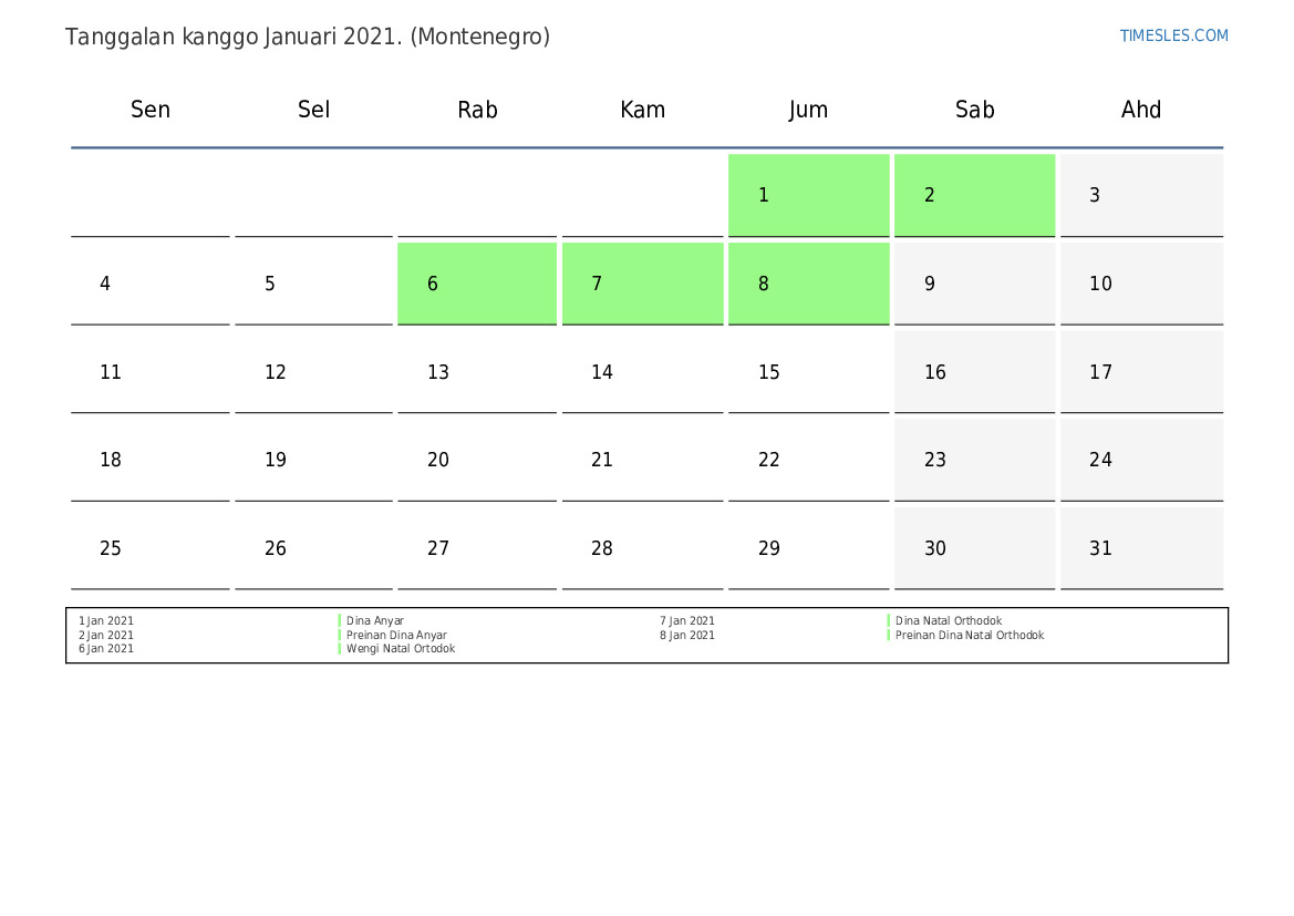 Ngundhuh lan nyithak tanggalan PDF kanthi preinan lan akhir minggu kanggo wulan Januari 2021 kanggo Montenegro