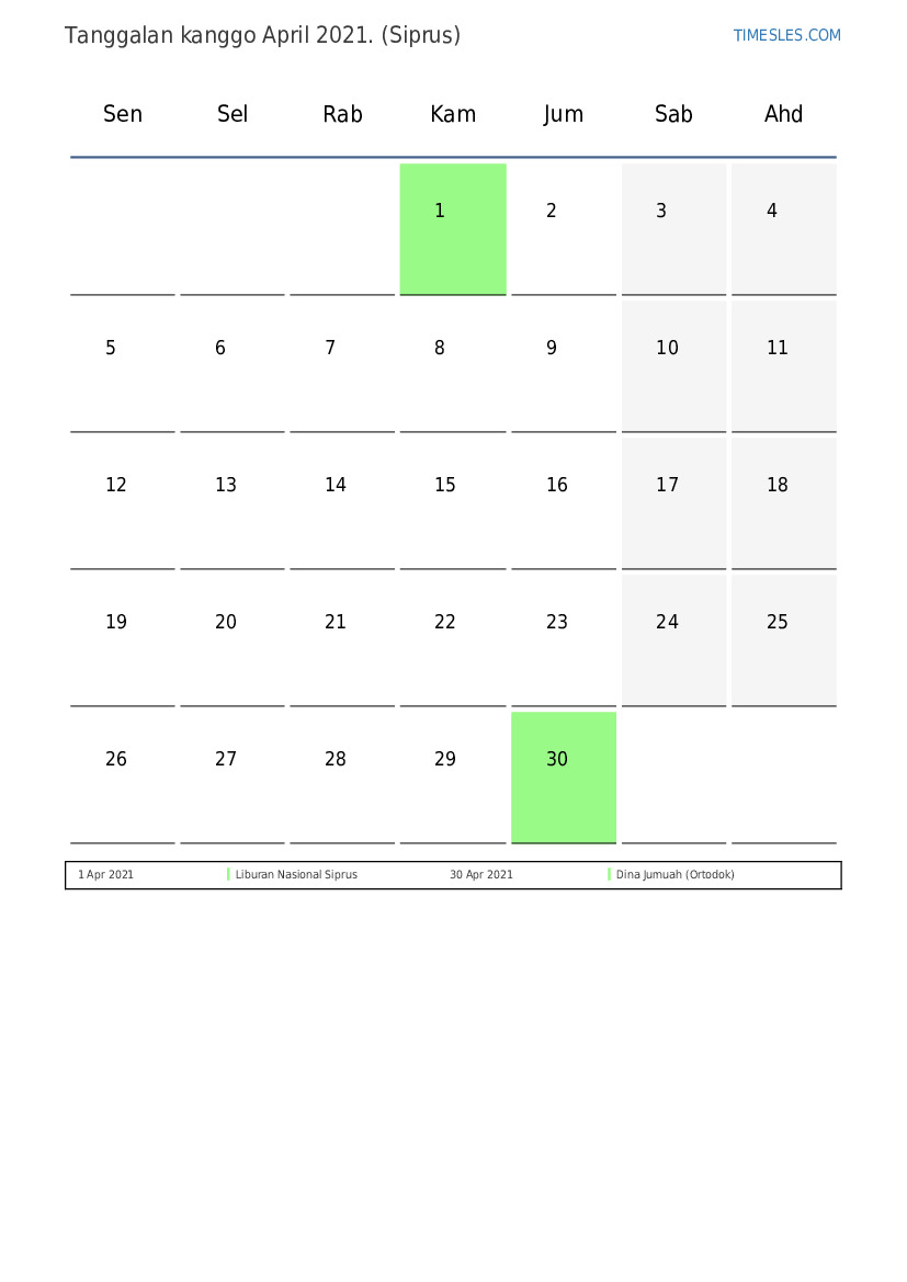 Ngundhuh lan nyithak tanggalan PDF kanthi preinan lan akhir minggu kanggo wulan April 2021 kanggo Siprus