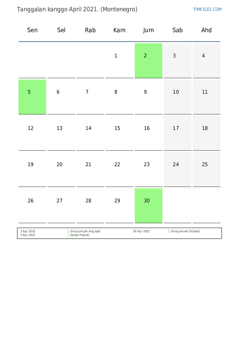 Ngundhuh lan nyithak tanggalan PDF kanthi preinan lan akhir minggu kanggo wulan April 2021 kanggo Montenegro