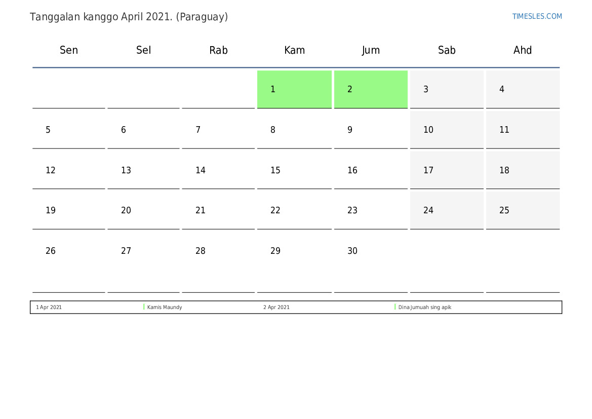 Ngundhuh lan nyithak tanggalan PDF kanthi preinan lan akhir minggu kanggo wulan April 2021 kanggo Paraguay