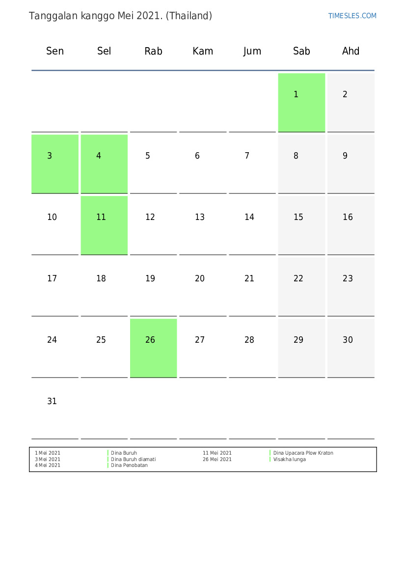 Kalender Liburan lan Akhir minggu kanggo wulan Mei 2021 kanggo Thailand