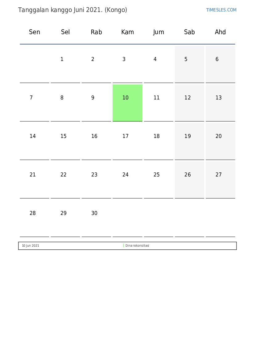 Ngundhuh lan nyithak tanggalan PDF kanthi preinan lan akhir minggu kanggo wulan Juni 2021 kanggo Kongo