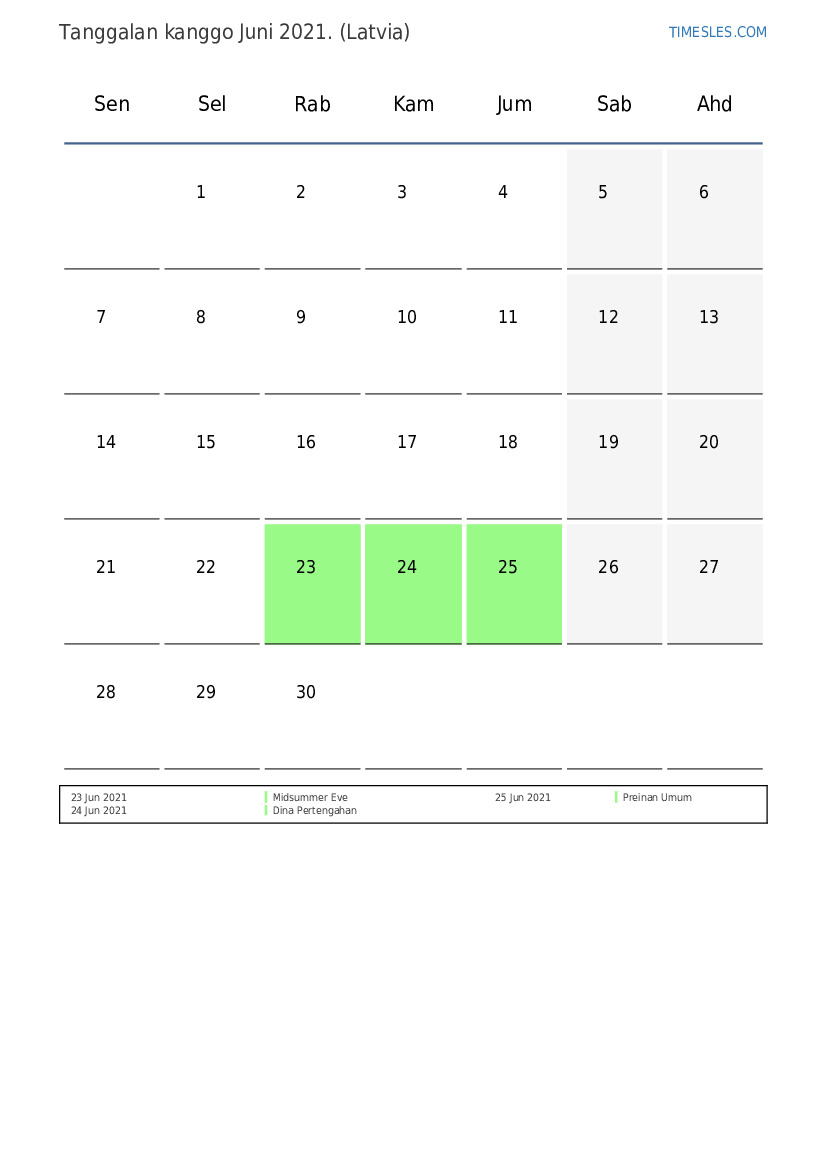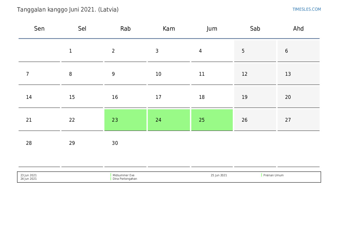 Ngundhuh lan nyithak tanggalan PDF kanthi preinan lan akhir minggu kanggo wulan Juni 2021 kanggo Latvia