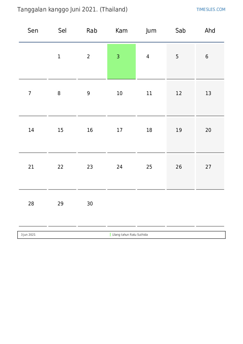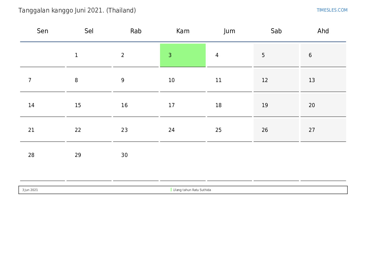 Ngundhuh lan nyithak tanggalan PDF kanthi preinan lan akhir minggu kanggo wulan Juni 2021 kanggo Thailand