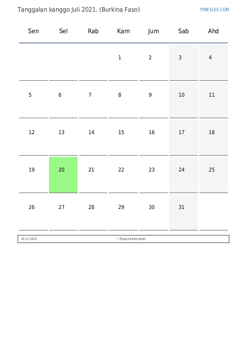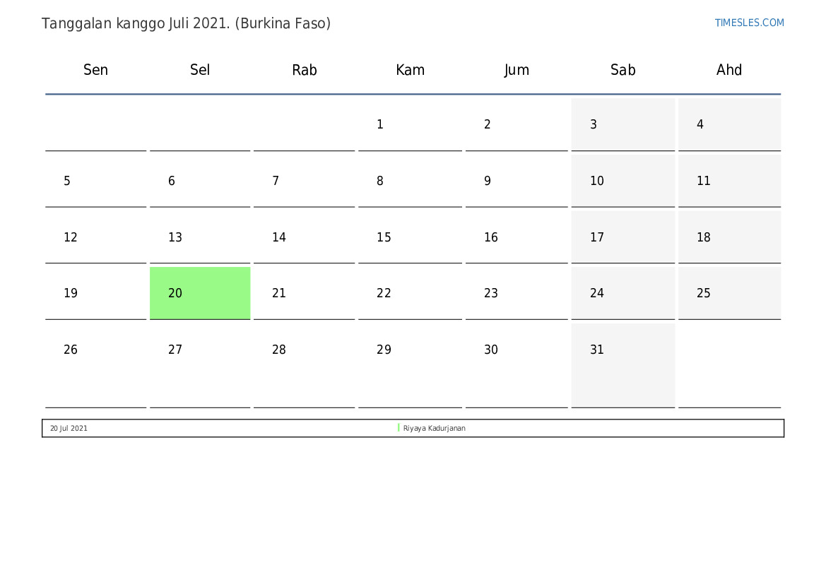 Ngundhuh lan nyithak tanggalan PDF kanthi preinan lan akhir minggu kanggo wulan Juli 2021 kanggo Burkina Faso