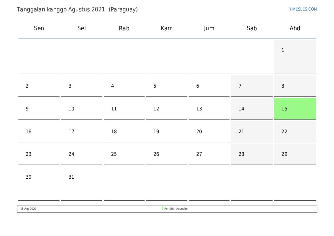 Ngundhuh lan nyithak tanggalan PDF kanthi preinan lan akhir minggu kanggo wulan Agustus 2021 kanggo Paraguay