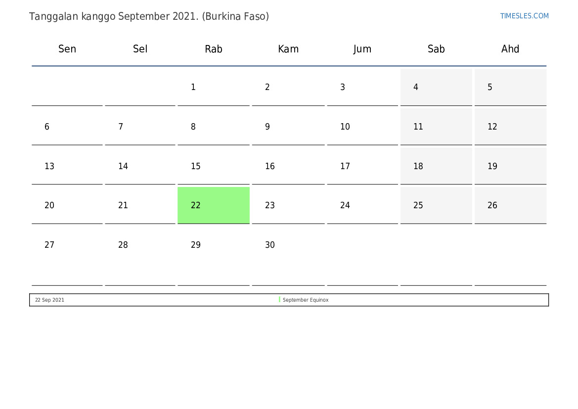 Kalender Liburan lan Akhir minggu kanggo wulan September 2021 kanggo Burkina Faso