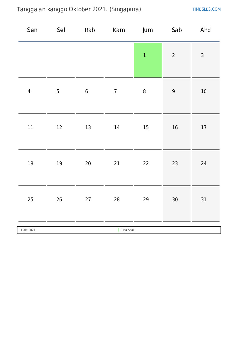 Ngundhuh lan nyithak tanggalan PDF kanthi preinan lan akhir minggu kanggo wulan Oktober 2021 kanggo Singapura