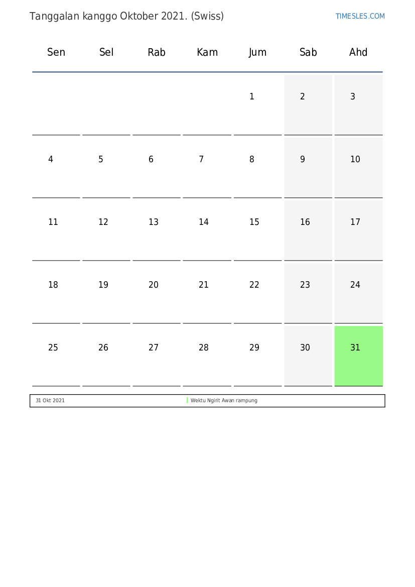 Wulan Oktober ngemot 31 dina. Iki umure 10 wulan 2021. Mangsa taun: musim gugur. Wulan Oktober diwiwiti dina Jumuah lan dina Minggu. Ing wulan Oktober 2021, ana 1 preinan lan dina dina ing Swiss.