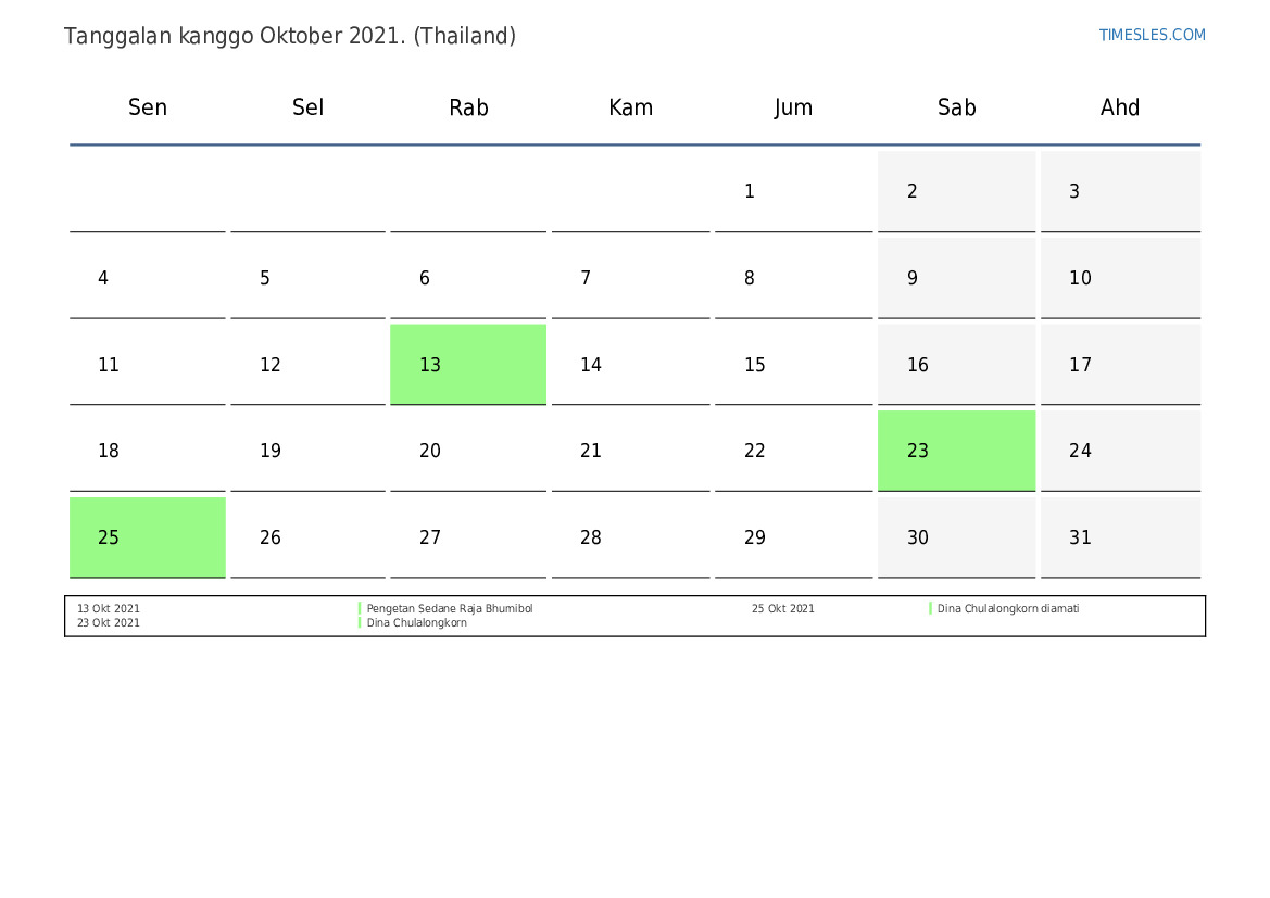 Kalender Liburan lan Akhir minggu kanggo wulan Oktober 2021 kanggo Thailand
