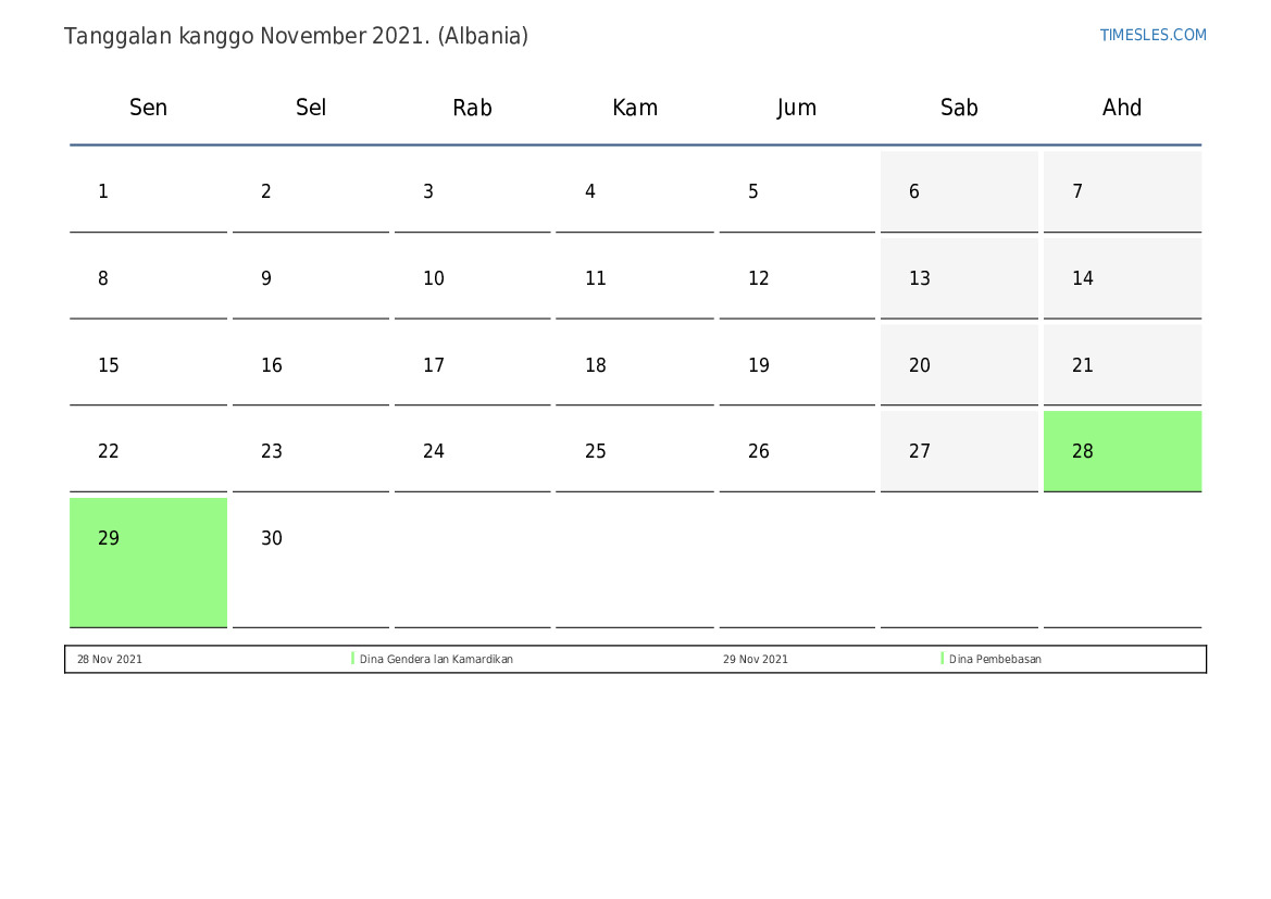 Ngundhuh lan nyithak tanggalan PDF kanthi preinan lan akhir minggu kanggo wulan November 2021 kanggo Albania