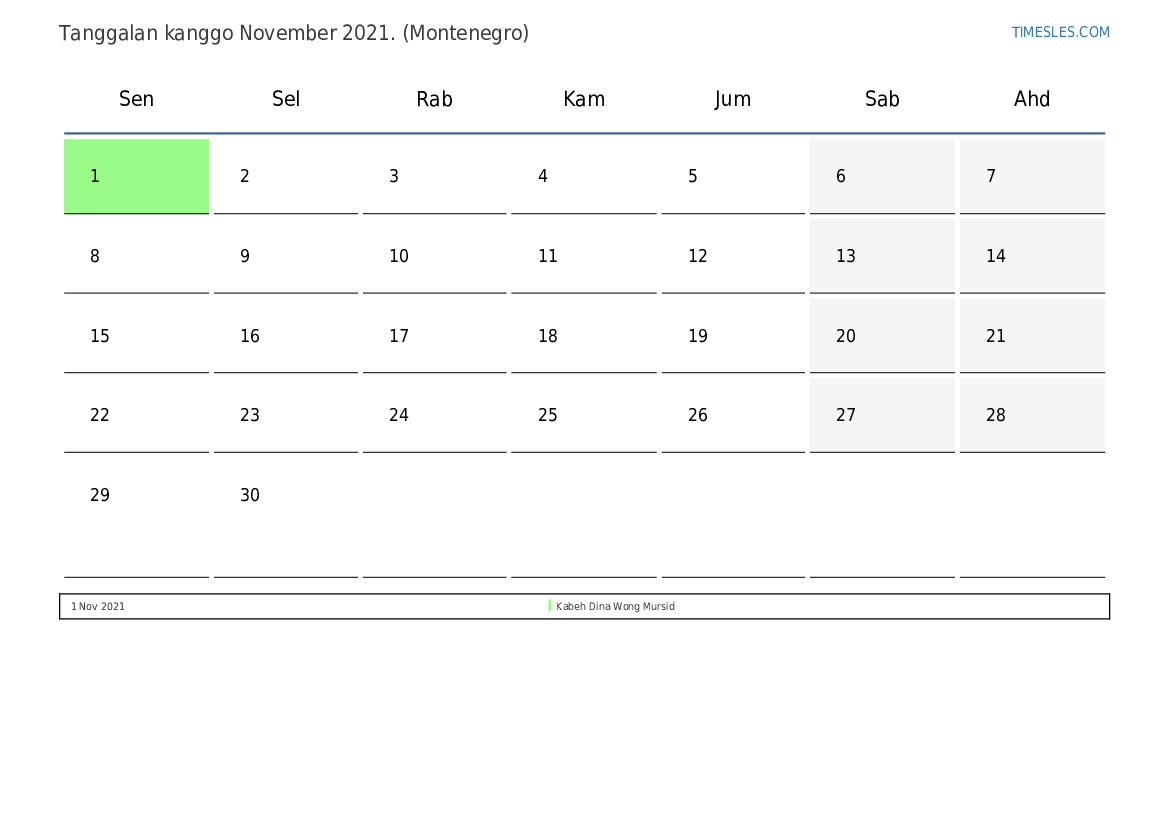 Ngundhuh lan nyithak tanggalan PDF kanthi preinan lan akhir minggu kanggo wulan November 2021 kanggo Montenegro