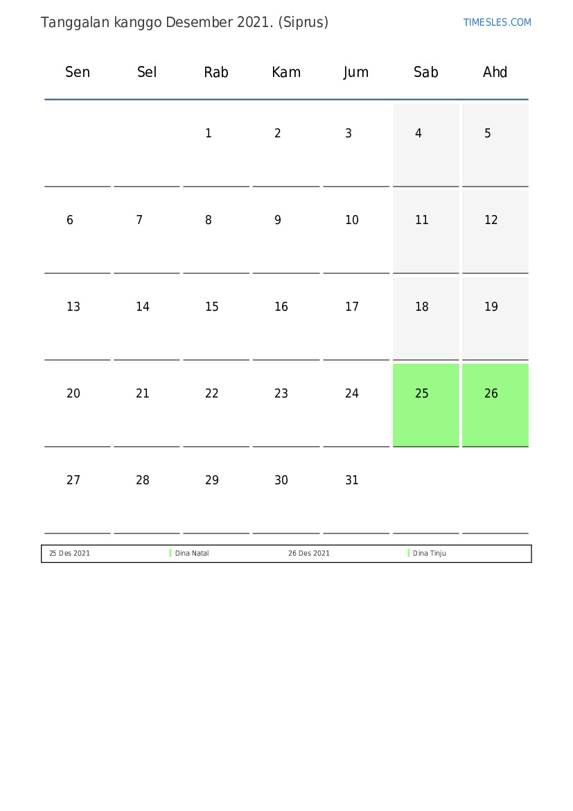 Ngundhuh lan nyithak tanggalan PDF kanthi preinan lan akhir minggu kanggo wulan Desember 2021 kanggo Siprus
