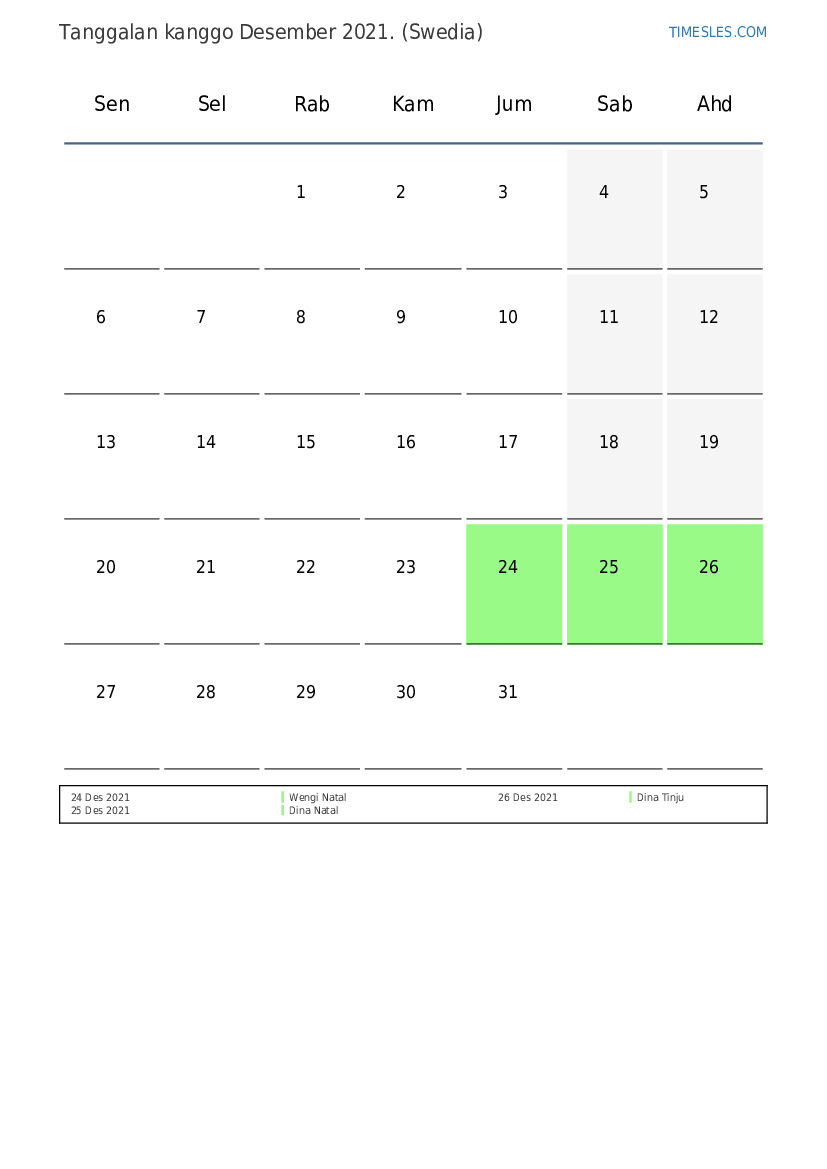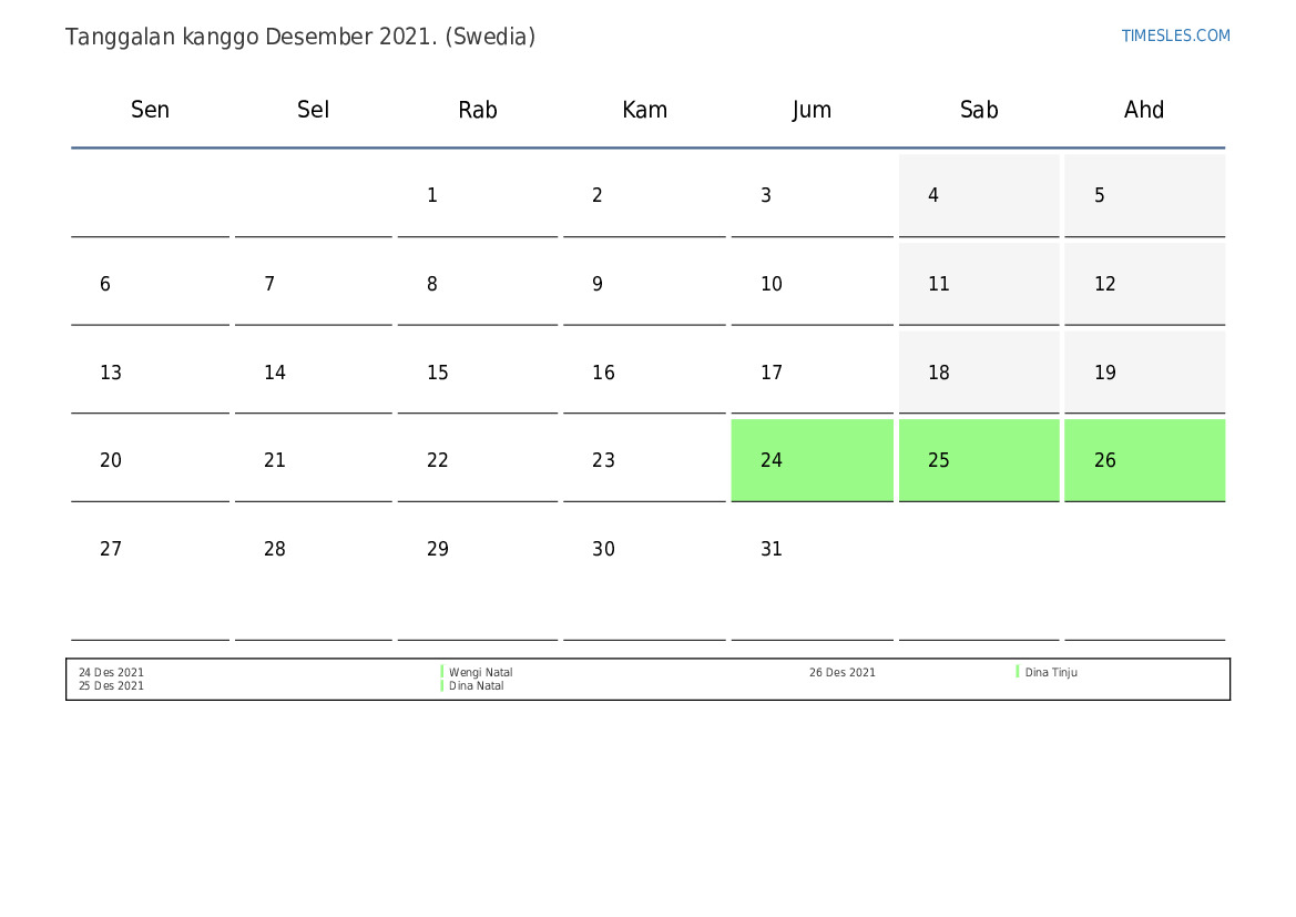 Ngundhuh lan nyithak tanggalan PDF kanthi preinan lan akhir minggu kanggo wulan Desember 2021 kanggo Swedia