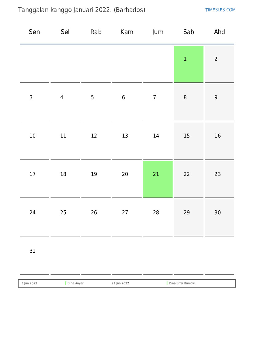 Ngundhuh lan nyithak tanggalan PDF kanthi preinan lan akhir minggu kanggo wulan Januari 2022 kanggo Barbados