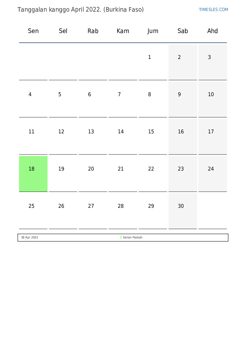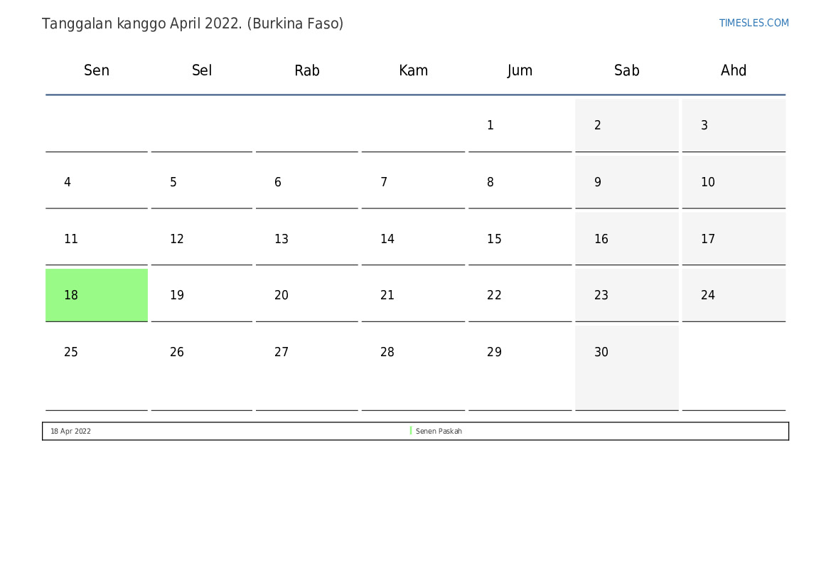 Ngundhuh lan nyithak tanggalan PDF kanthi preinan lan akhir minggu kanggo wulan April 2022 kanggo Burkina Faso