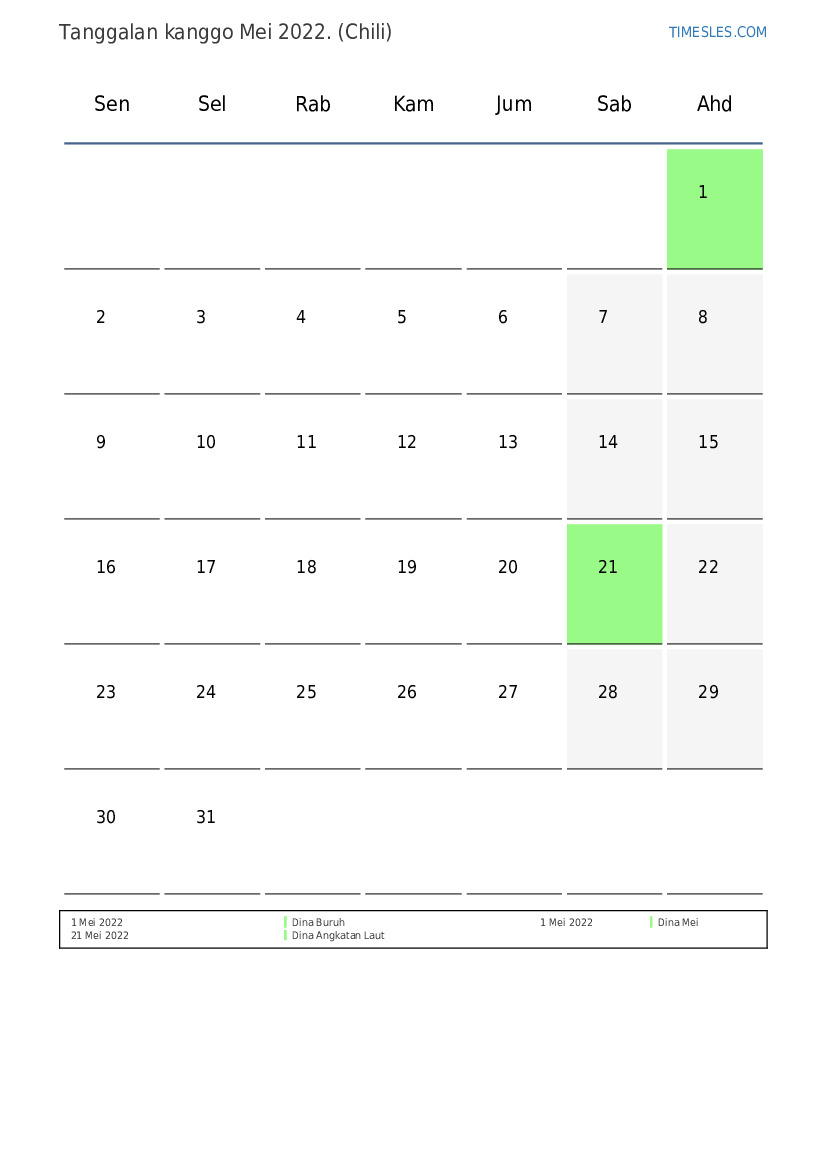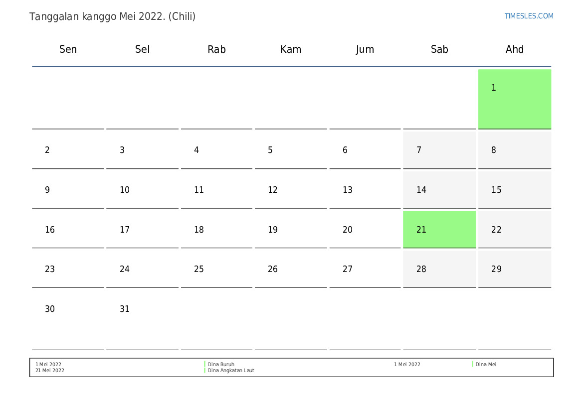 Ngundhuh lan nyithak tanggalan PDF kanthi preinan lan akhir minggu kanggo wulan Mei 2022 kanggo Chili