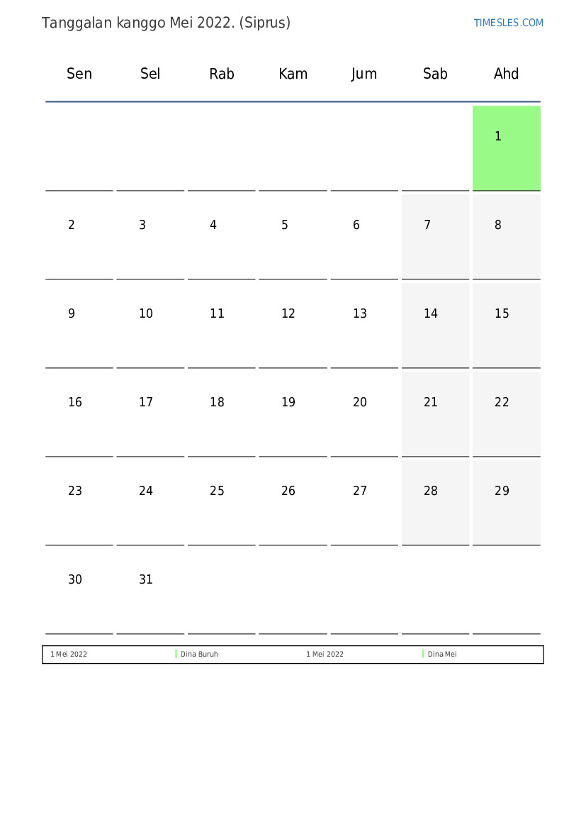 Ngundhuh lan nyithak tanggalan PDF kanthi preinan lan akhir minggu kanggo wulan Mei 2022 kanggo Siprus
